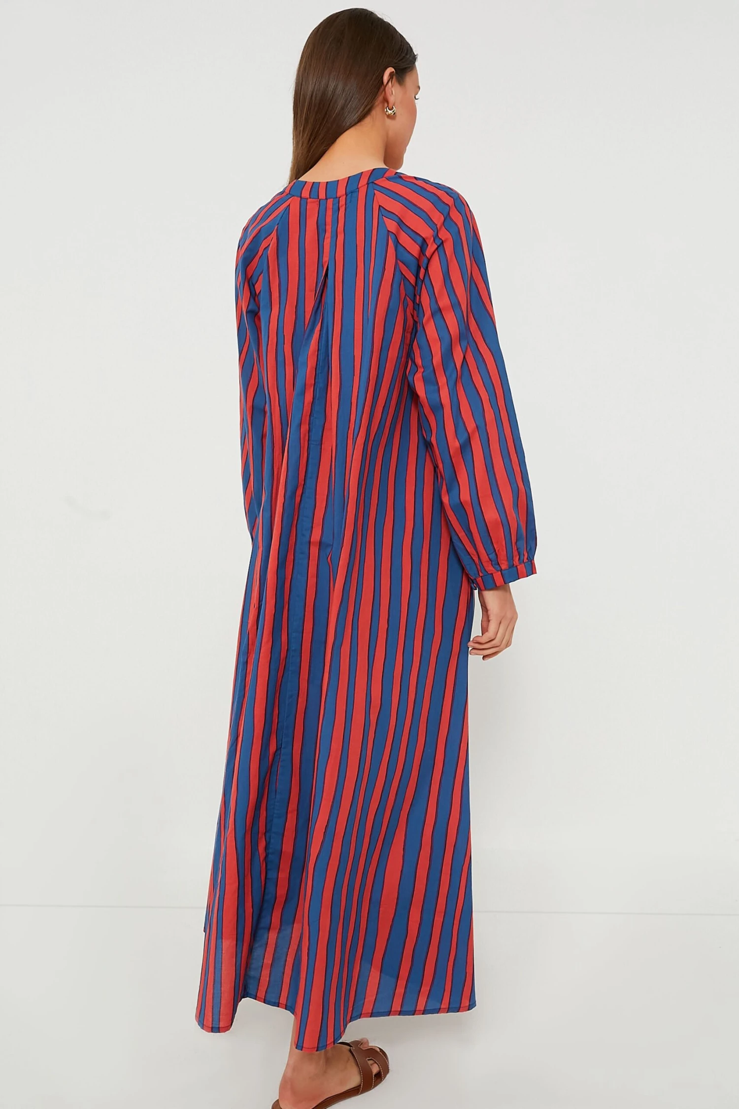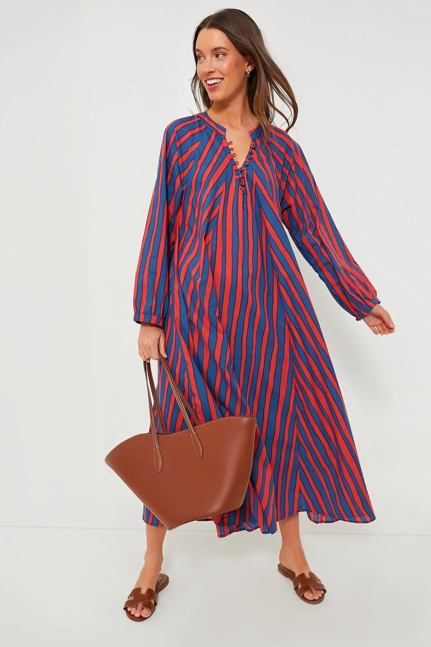 Easy and breezy, the Batik Stripe Blood Orange Fiore Dress is ideal for the warm-weather months. An A-line silhouette, this maxi features long blouson sleeves, a V-neckline with covered buttons, and a relaxed fit that is decorated in eye-catching blue and orange stripes. Pair with sandals and a tote for casual weekends, or dress up with wedges and statement jewelry.