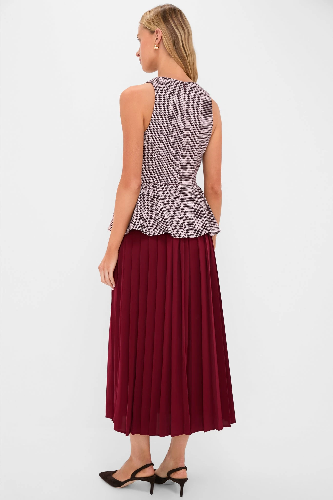 With a fitted bodice, featuring a V-neckline, fabric covered button detailing, and a peplum hem, the Berry Long Peplum Dress is an elegant dress for any occasion. A solid berry hued pleated skirt finishes the dress in a timeless fashion. Pair with heels, gold jewels, and a handbag for an effortlessly chic look.