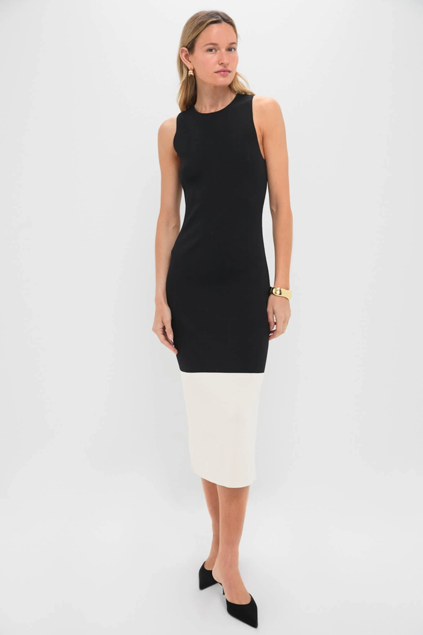 With its sleek black-and-cream colorblock and flattering, body-skimming fit, this knit midi balances modern polish with everyday ease. Just add heels or a statement cuff and head out—no overthinking required.