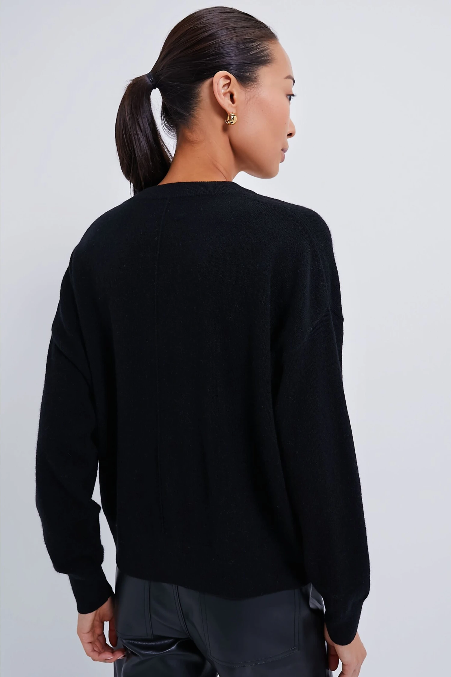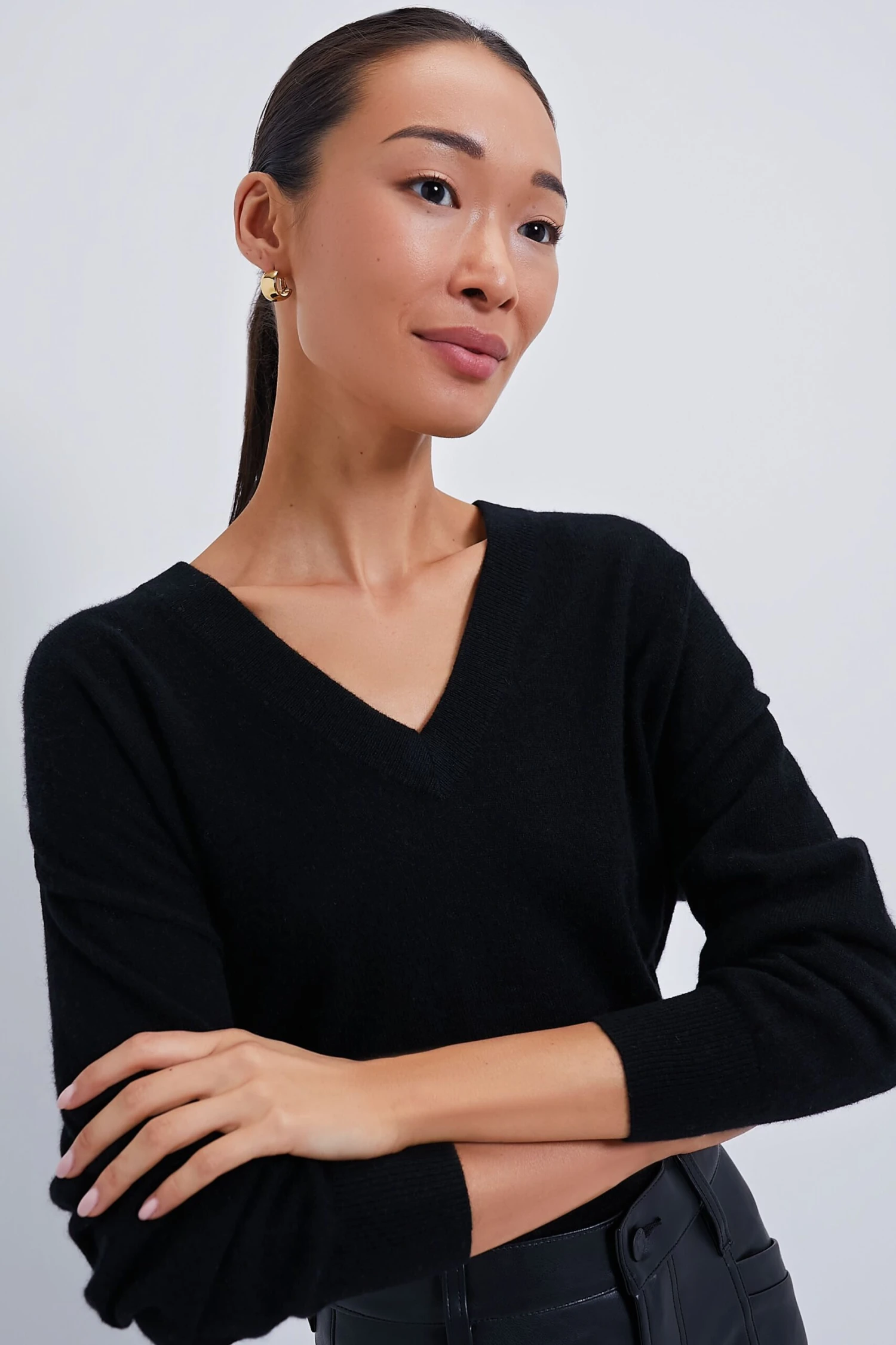 The Black Emma Boyfriend Sweater is an elevated style with a cool-girl-chic look. This V-neck top features a slightly oversized fit in an ultra-soft cashmere fabric. Pair with a skirt and ballet sandals or denim and ballet flats for a sophisticated look.