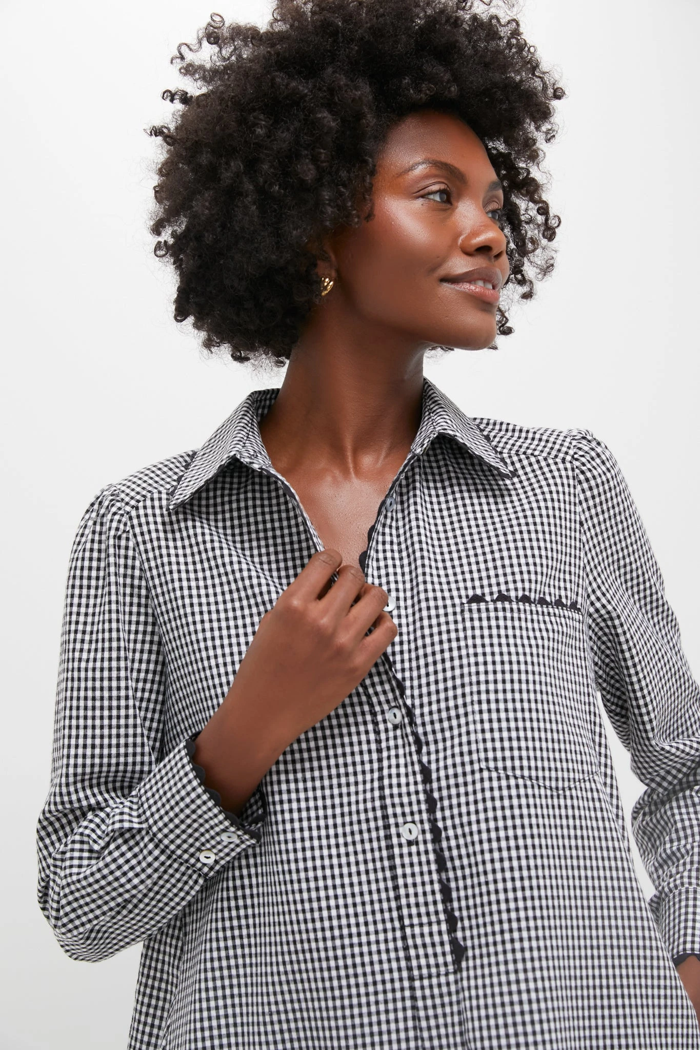 The Black Gingham Callahan Shirt Dress perfectly merges classic and trendy with its button front half placket and flirty flutter hemline that encapsulates unfussy femininity. With ric rac detailing on the collar, placket, cuffs, and hemline, this dress has the little something special you’re looking for. We are pairing this fun piece with flats, sneakers, or sandals, and your favorite clutch or tote!