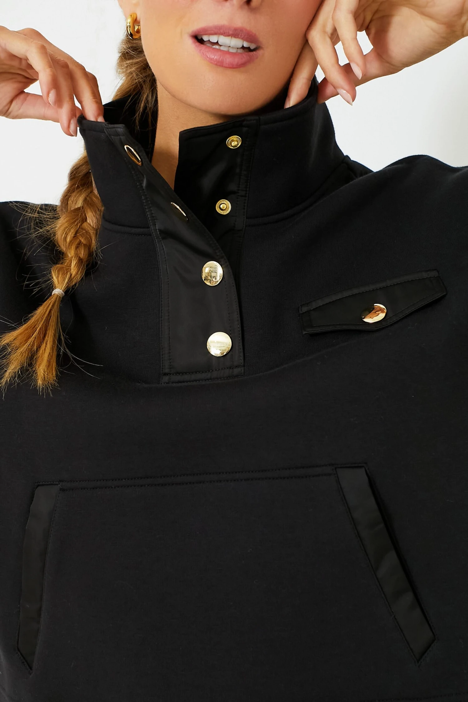 The Snap Neck Bailey Pullover is like a trusty best friend- with chic details such as the gold snap buttons and funnel neck, this functional (and comfy) style is perfect for warming up on the courts or grabbing dinner with the gals!