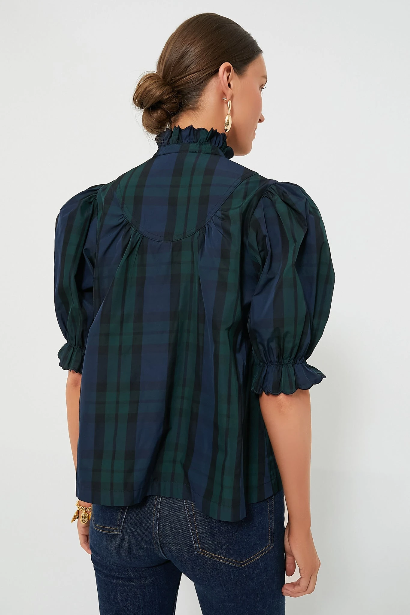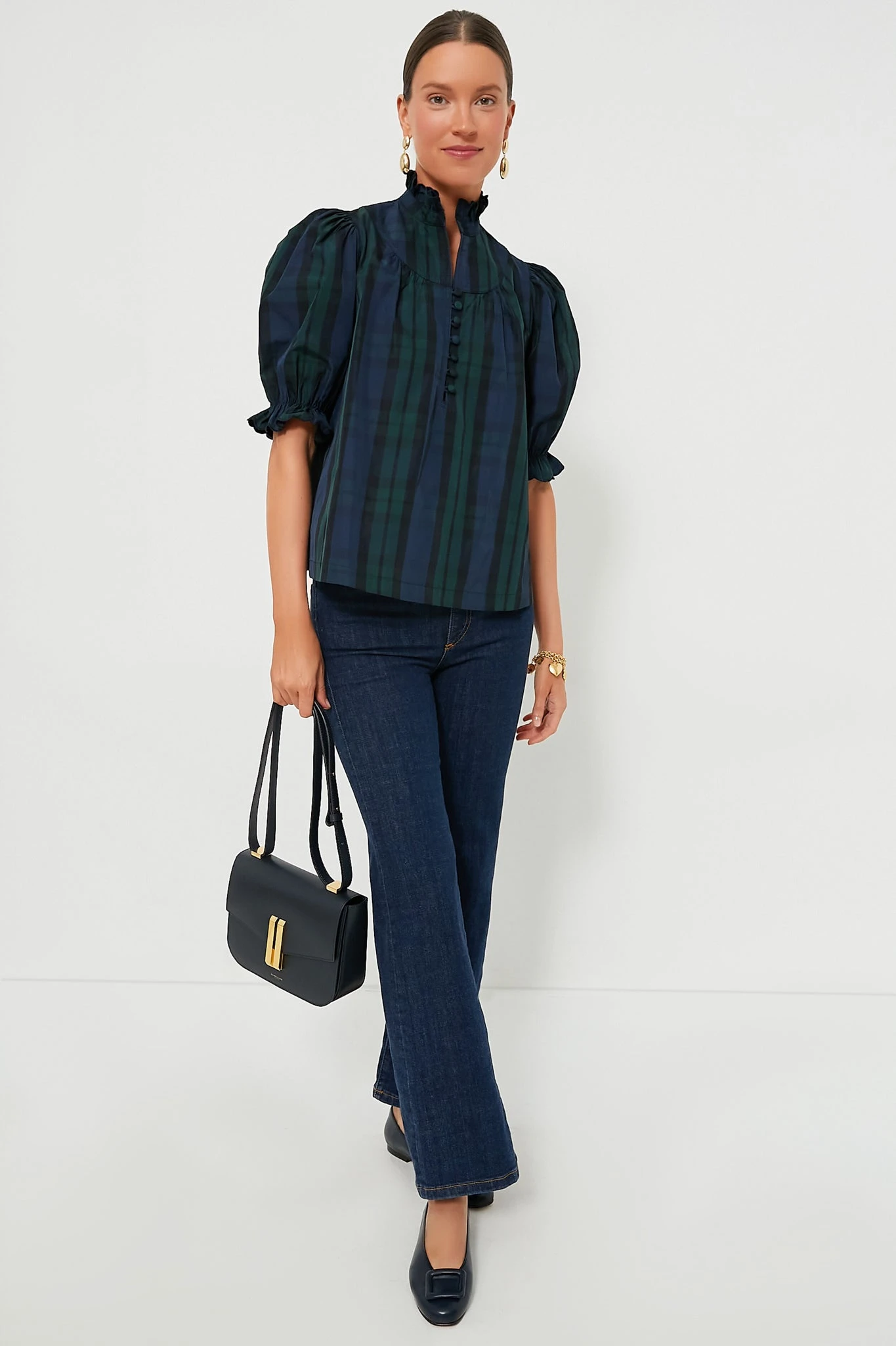 Meet the Blackwatch Selena Blouse. Effortlessly chic, we love the romantic details of this fun and feminine number. Featuring a ruffle stand collar and quarter length front placket with covered buttons, this puff-sleeved piece pairs well with dark denim and booties for daytime and can be elevated with leather pants, heels, and a clutch for a night out or a party.