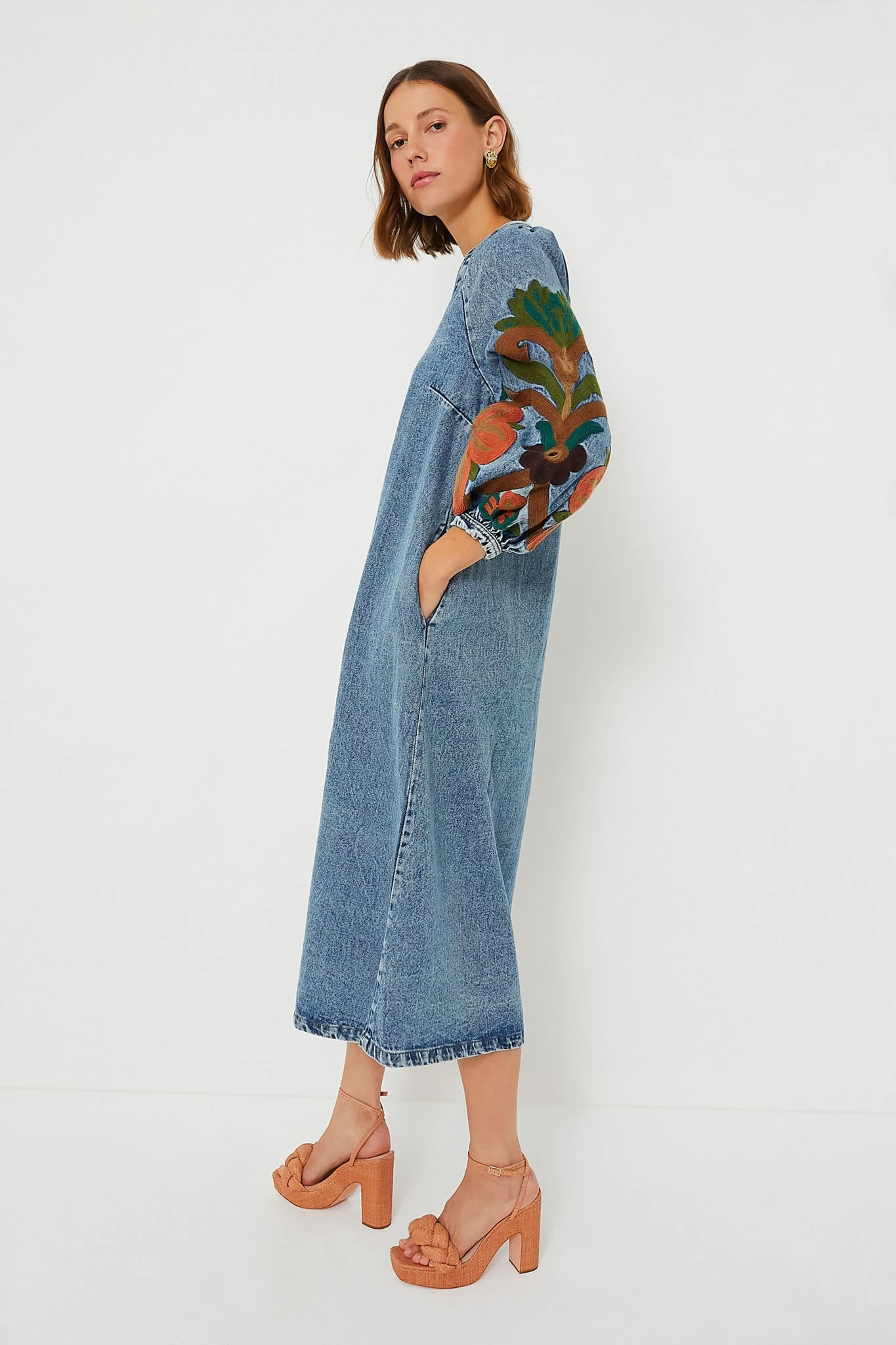 The Cathleen Dress takes a classic denim jumper and upgrades it with unique and eye-catching sleeves. The dramatic embroidered puff sleeves add a sophisticated touch to the sleek A-line silhouette. Pair with heels and colorful earrings for a look that can be worn from brunches to happy hours.