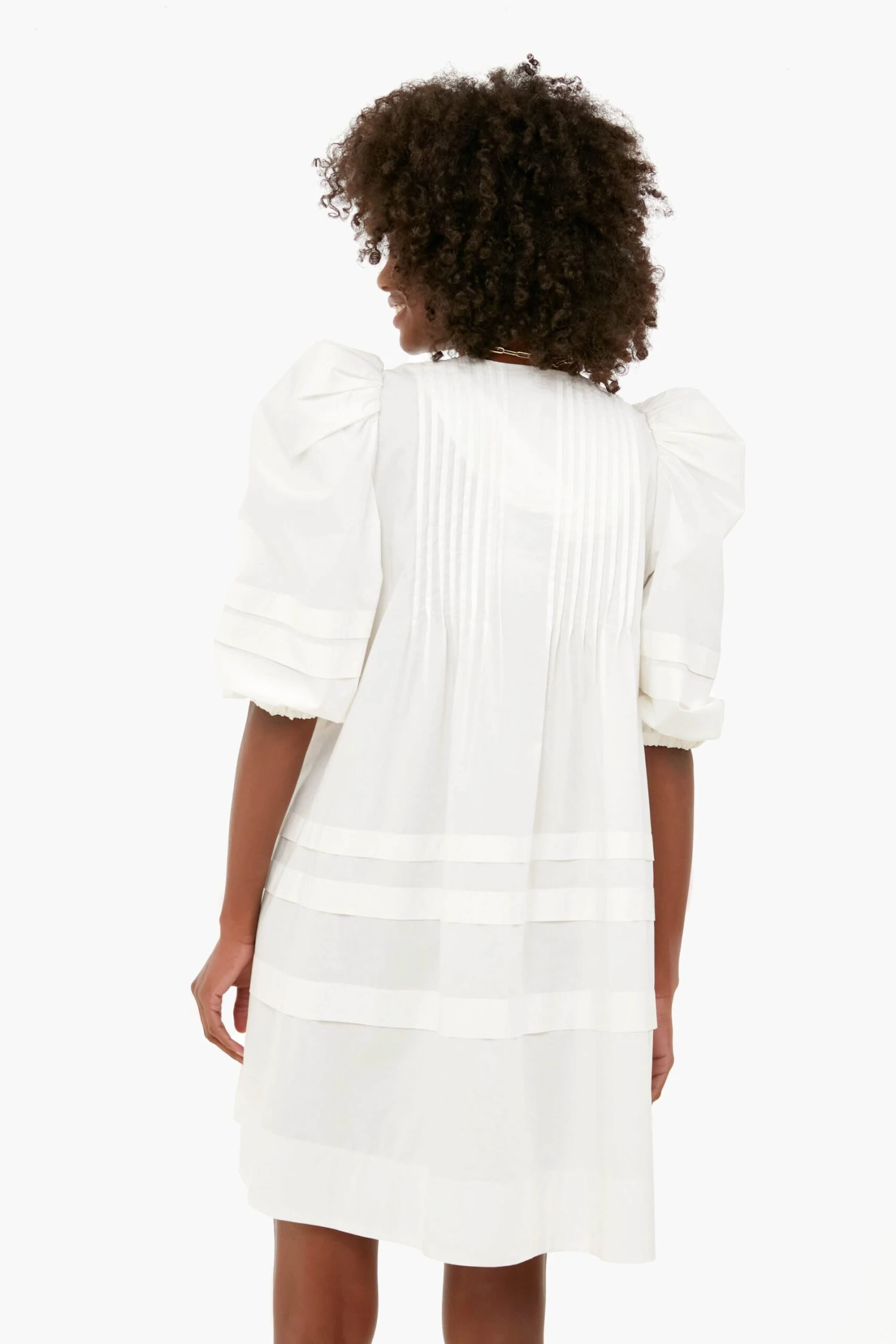 The Jenkins Dress is made from crisp white cotton with a covered button placket. Featuring dramatic puff shoulders, a v-neckline, and ballet-length sleeves, this style is playful and elegant. Add gold jewelry and raffia accessories for dinner al fresco!