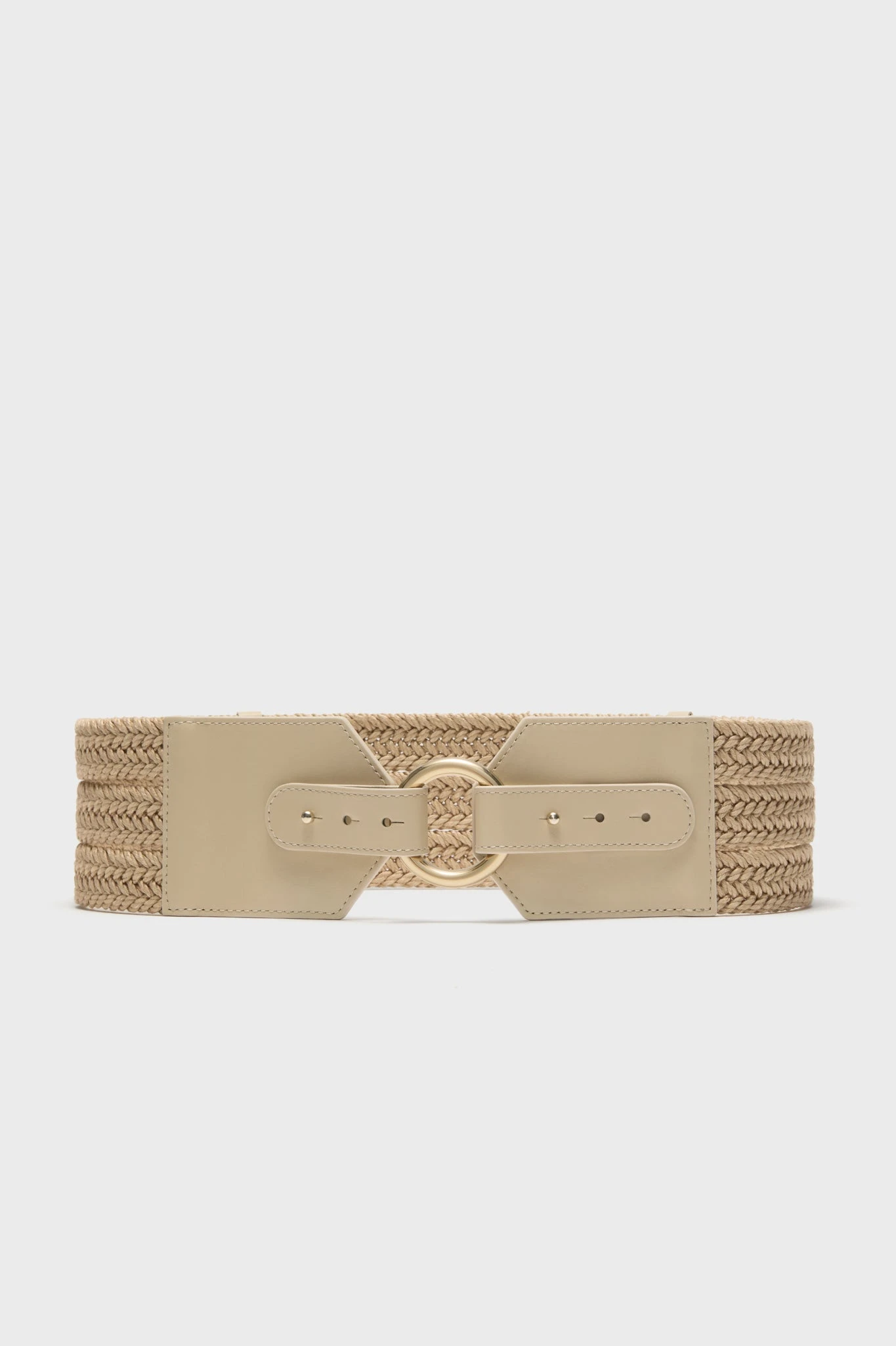 Woven in Italy, this Champagne and Gold Odin Linen Belt is designed with a braided cotton linen strap complemented by leather accents. Wear this chic waist belt with dresses, skirts, blazers, or high-waisted pants to cinch the waist and create a flattering silhouette.