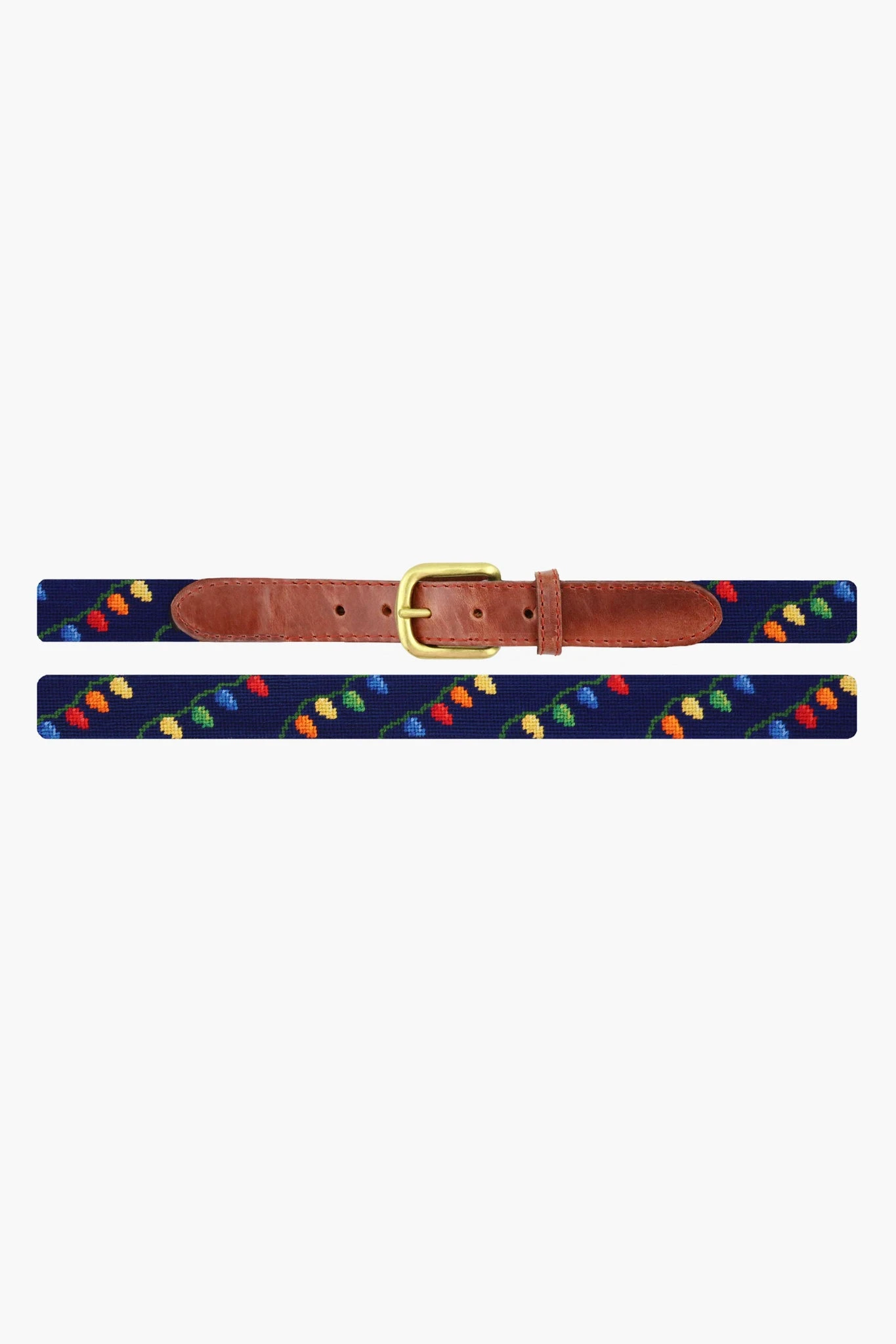 Get in the holiday spirit with the Christmas Lights Needlepoint Childrens Belt. Made from durable materials and is entirely hand-stitched, this accessory is finished with a solid brass buckle and full grain leather trim. Perfect for helping your kiddo look cute for family photos, holiday parties, and more, this is sure to become a favorite.