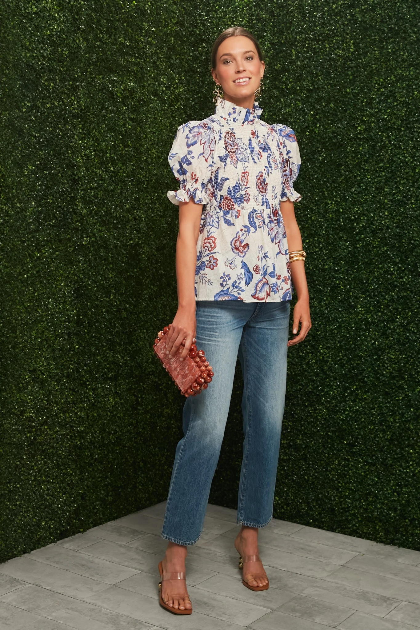 Drawing inspiration from sweet summertime foliage, the Cream Heirloom Floral Rowen Blouse combines feminine details with an easy cotton fabric for a statement top you will grab for time after time. Featuring a ruffle stand collar, puff sleeves and a smocked bodice attached to an always flatter empire waist silhouette, this blouse checks all the boxes.