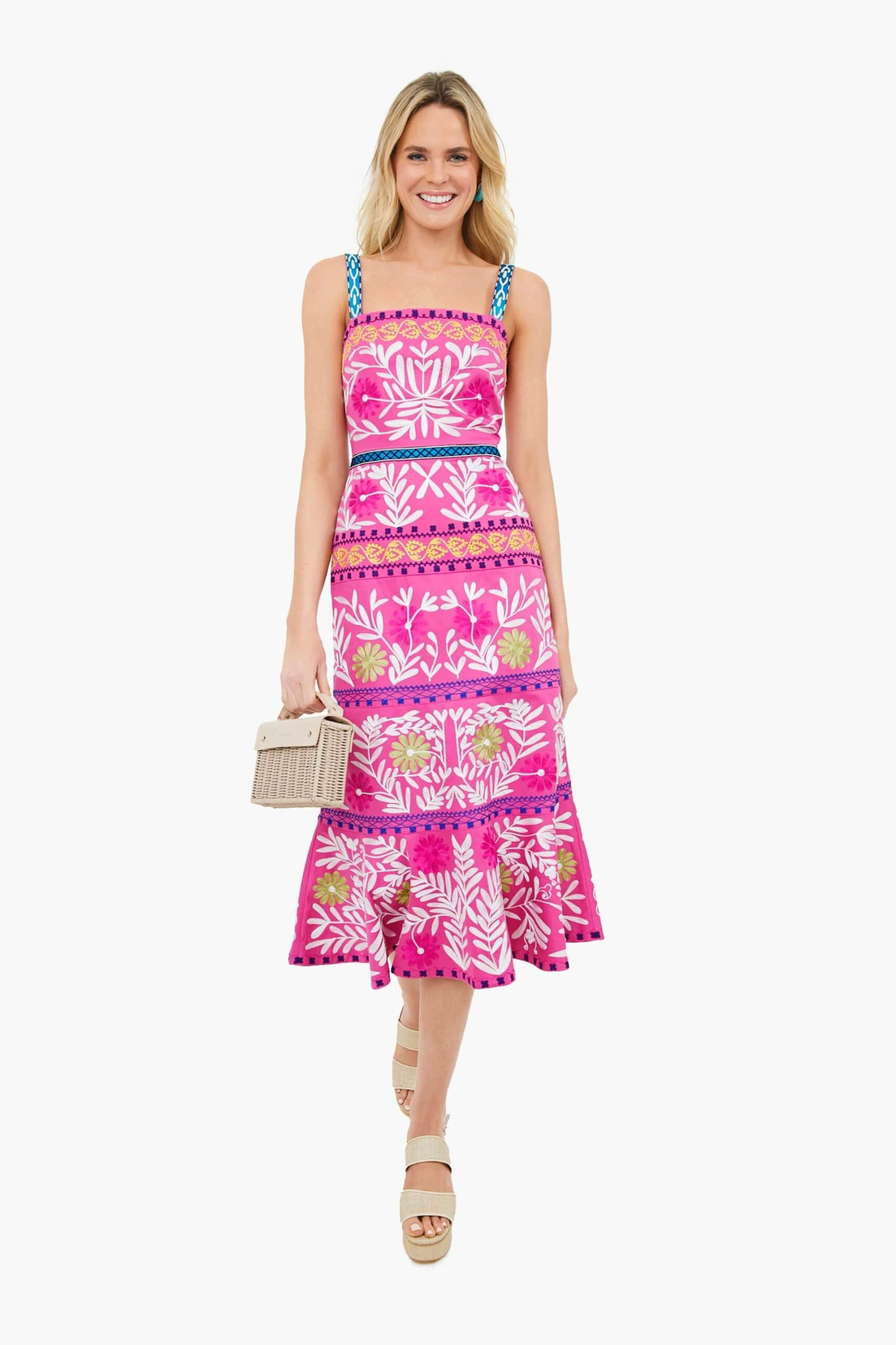 The Shy Heel is anything but bashful. This platform shoe gives ultimate lift and hold. This style features two large straps on the front and an adjustable strap around the heel detailed with contrasting off-white piping. Add a colorful cocktail dress for a beachfront wedding this season.