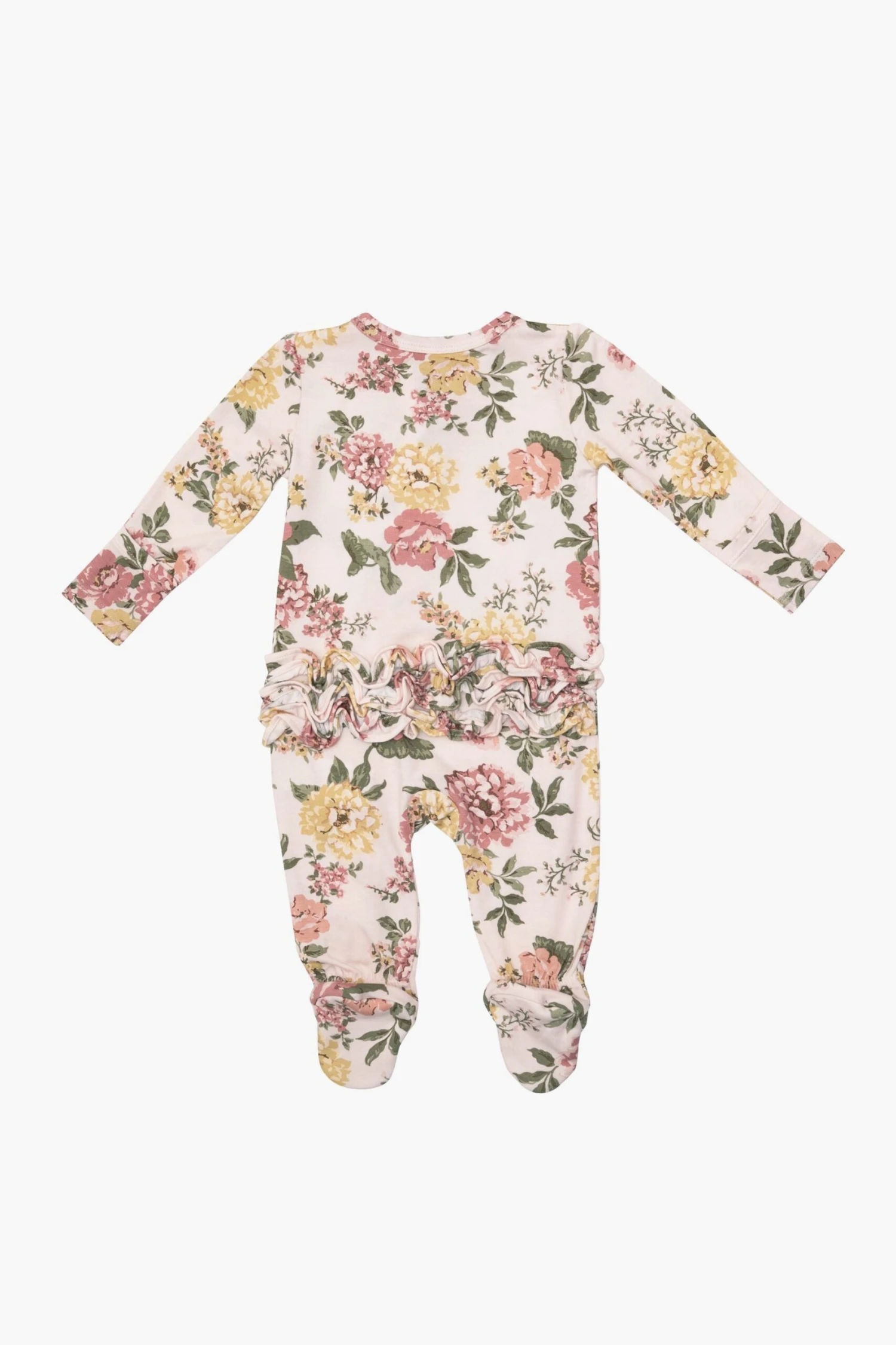 The Dahlia Ruffle Zipper Footie is here to help you change your baby in a snap (or in this case, a zip). This one piece features all the tiny details that mean so much when it comes to your little one — fold over cuffs at the sleeves to help prevent accidental scratches, a zipper guard at the chin, and fleece lining at the feet to provide extra coziness. Super soft bamboo fiber fabric and a fun print complete this go-to silhouette, making this the comfiest onesie there is, so all you have to worry about is which bedtime story to pick!