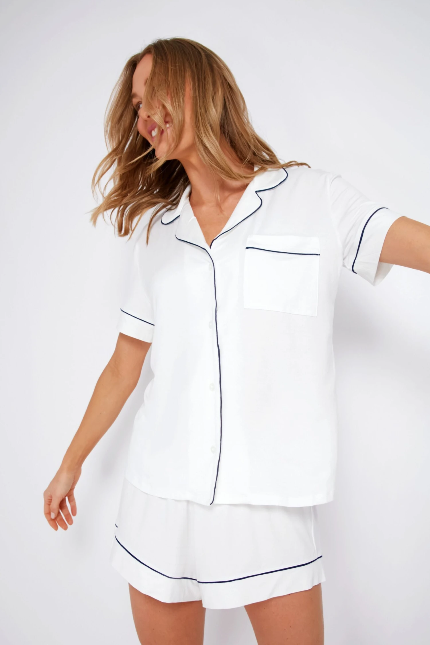Does anything feel better than cozying up in a chic PJ set? The Ivory and Navy Gisele Short Sleeve PJ Set merges classic silhouettes with sustainable TENCEL™ Modal fibers for the perfect relaxed fit. Cut from luxurious, temperature-regulating knit fabric that drapes and falls in all the right ways, your body will be enveloped in comfort from the second you put these on. Plus, it’s machine washable and gentle on the skin, so it not only feels beautiful but it’s easy to care for too. A roomy shape, extra coverage, and the most cozy fit that you can wear and gift with confidence– these pajamas are a no brainer!