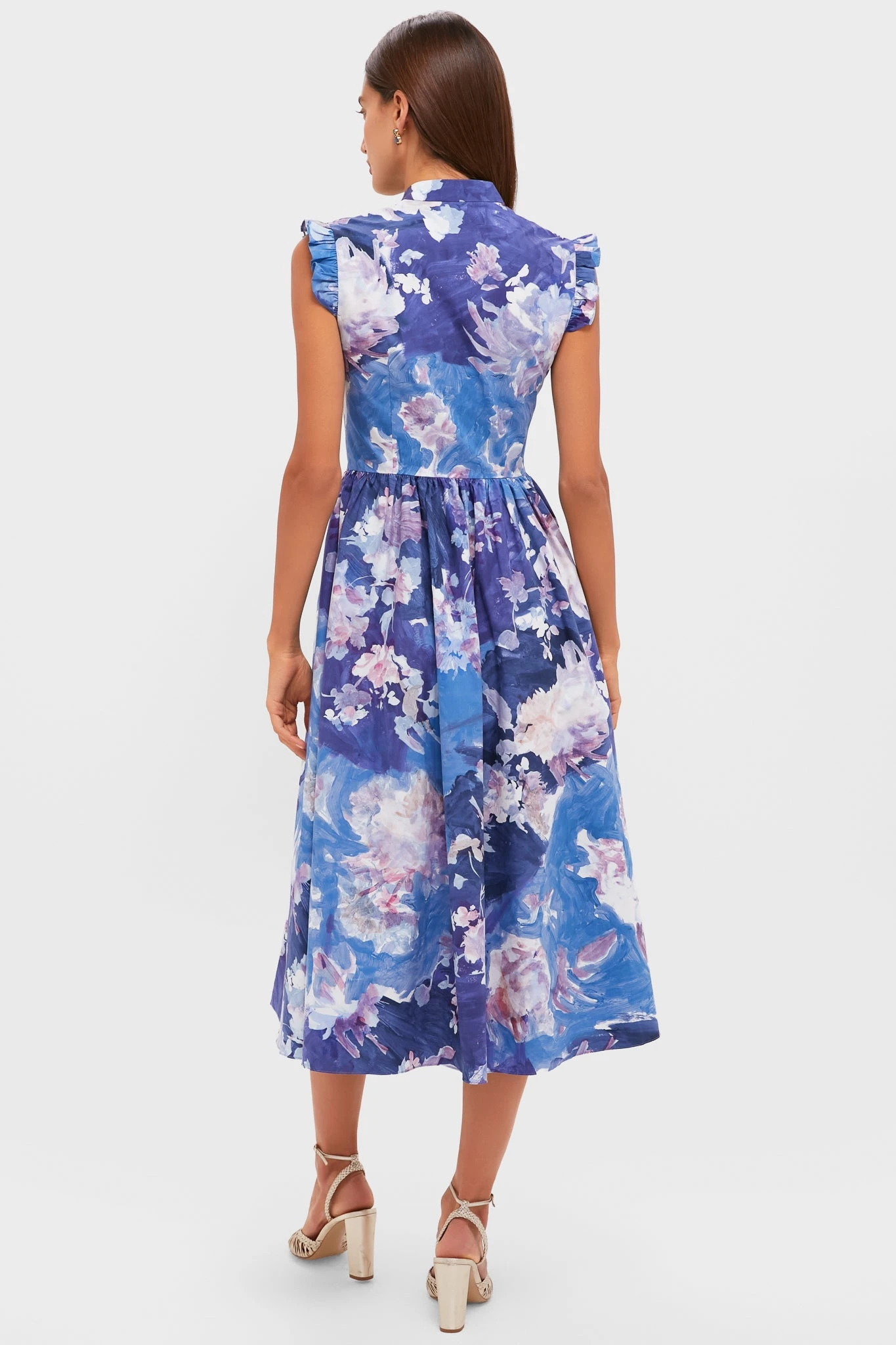 This sleeveless midi dress features ruffled shoulders, a fitted bodice, and a flared A-line skirt, all done in crisp cotton poplin. The cobalt floral print feels painterly and bold—easy to dress up with strappy heels or down with flats for a gallery date or summer dinner.