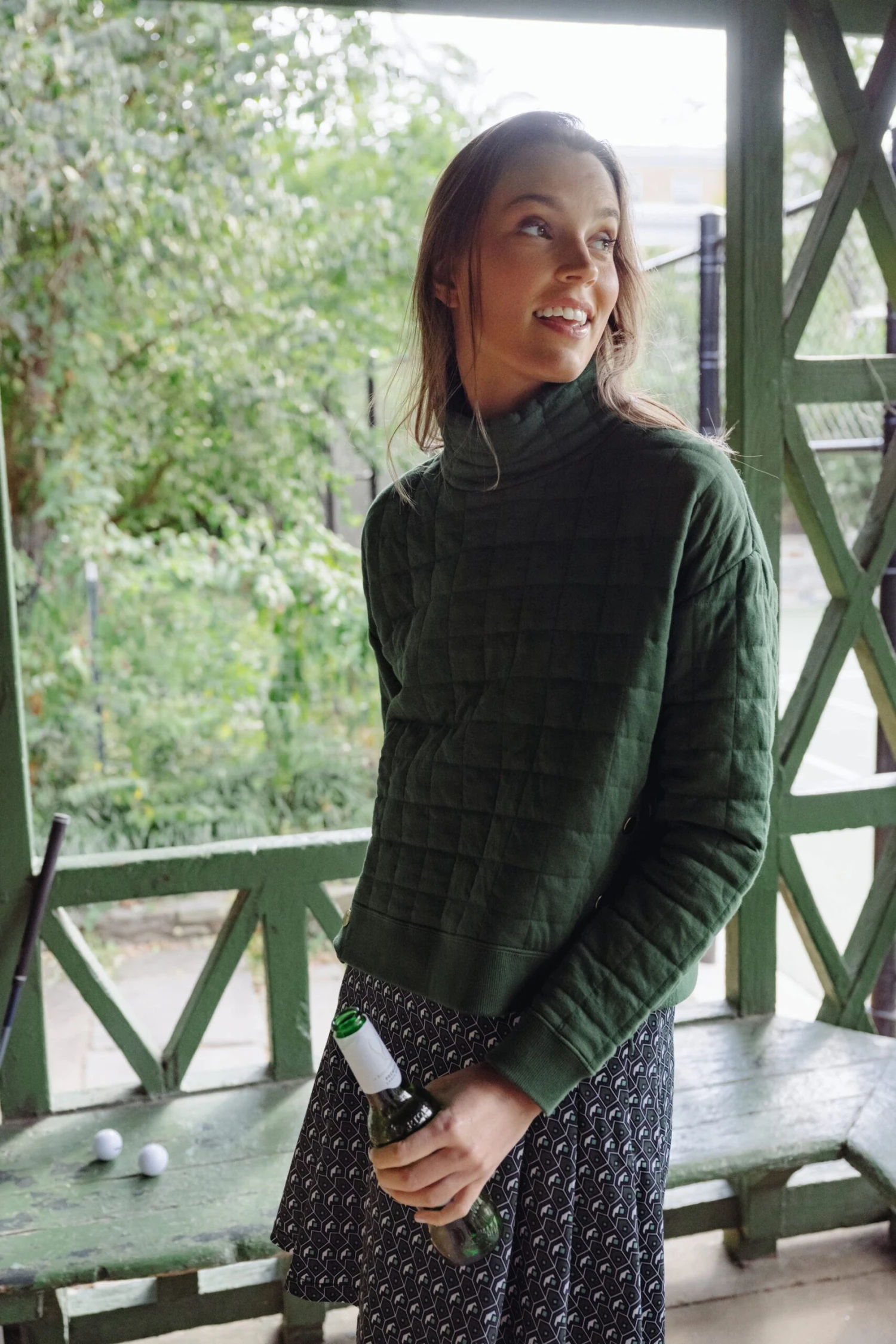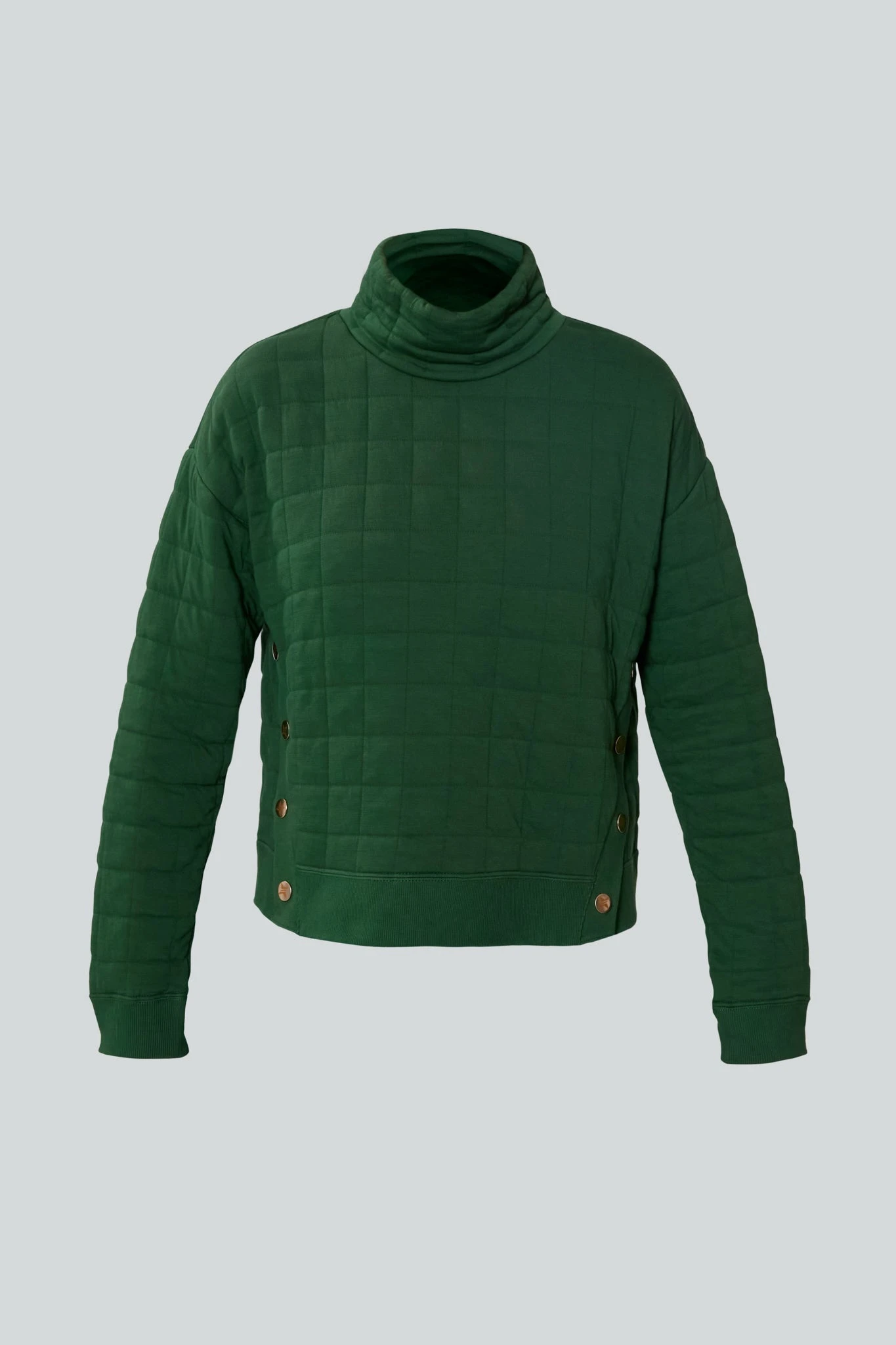 The Quilted Funnel Neck the comfy-cozy (yet elevated) style of our dreams! This chic pullover features a high neck, quilted body, and side snap closures for a look that can be worn with a tennis skirt or denim alike.