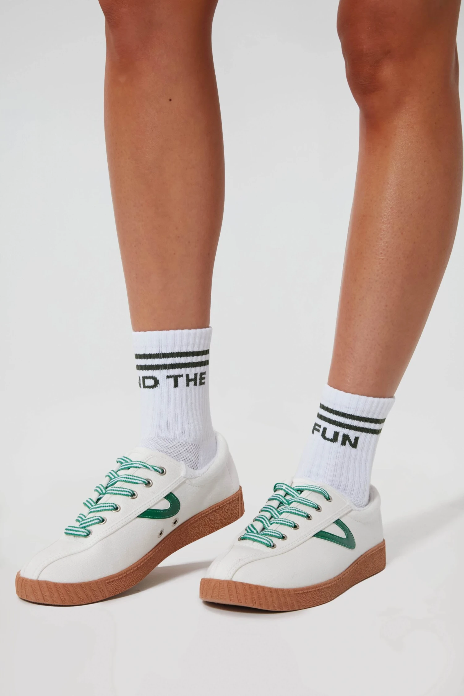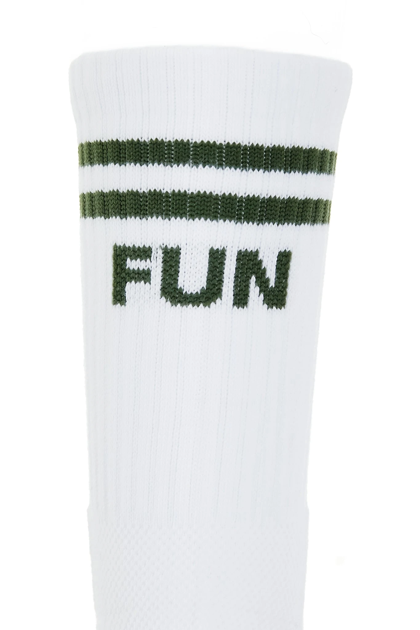 The Find the Fun Socks will be your good luck charm next time you play a match. With a crew length, breathable material, and fun graphic you can wear these with a pair of sneakers or loafers!
