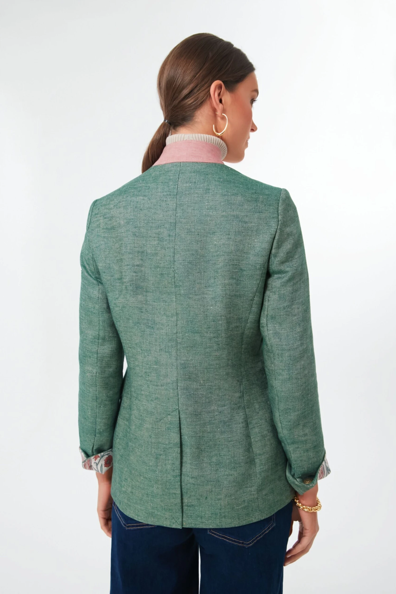Based on the alpine peasant “trachen jacken” which symbolizes a connection to earth, reimagined for the modern city, the Green Linen Camille Tale Jacket is refined and unique. Constructed in a flattering silhouette, the details are never ending for this number with a contrast collar, exaggerated cuffs in a pink and white floral print, button front placket with decorated brass buttons, and designed in the perfect forest shade that’s not too washed out. Pair with trousers, over a dress, with your favorite baggy denim, you name it– this classic-with-a-twist piece is the best way to give your outfit a refresh.