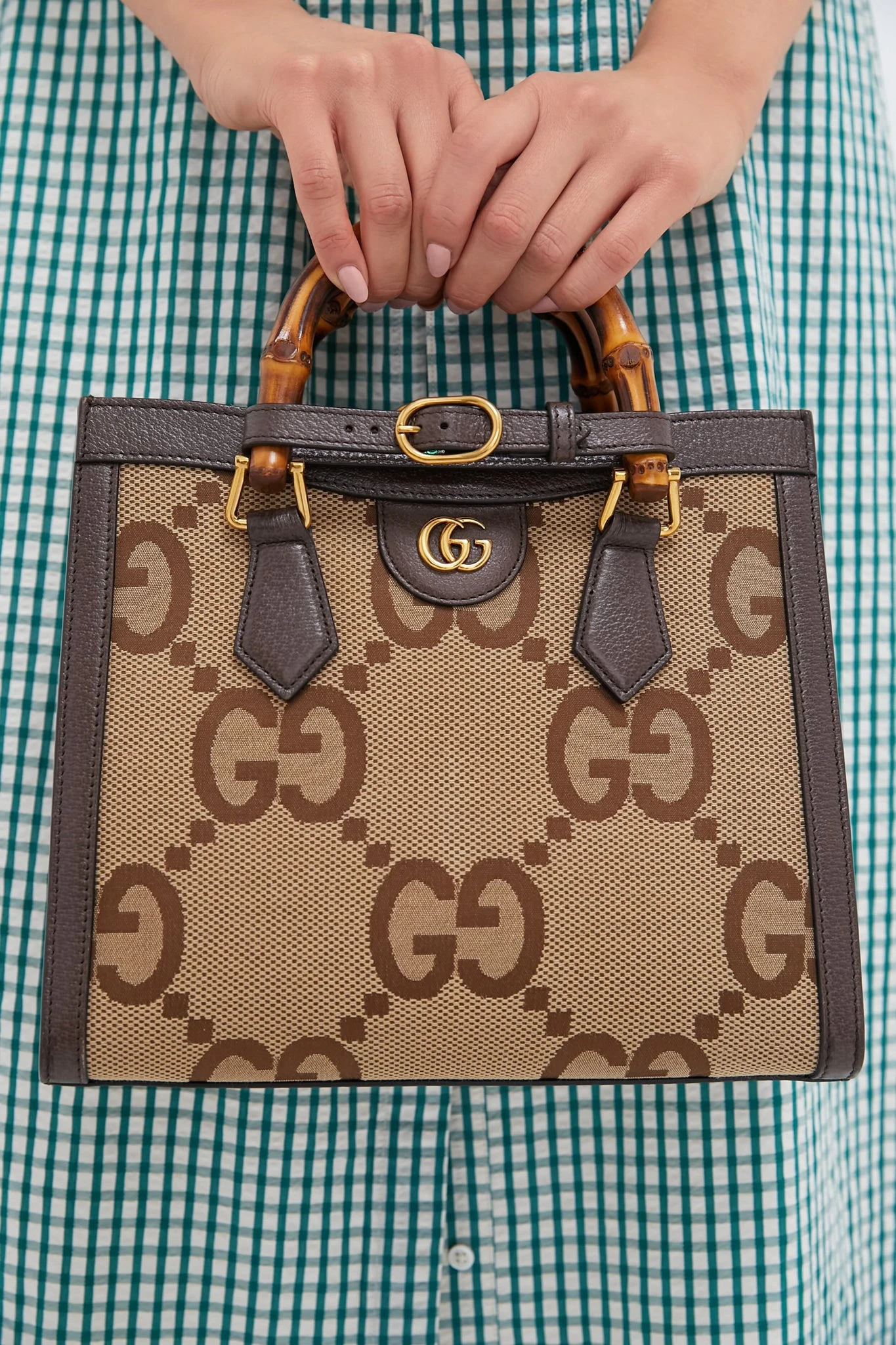 The GUCCI Small Diana Tote Bag is crafted of jumbo GG monogram canvas and calfskin leather in brown. With sturdy bamboo top handles, an optional leather shoulder strap, and 2 belt handle shapers in brown, this tote also features an aged gold interlocking GG logo, and a crossover magnetic flap closure that leads to a beige leather interior. This exquisite beauty can be paired with everything in your closet.