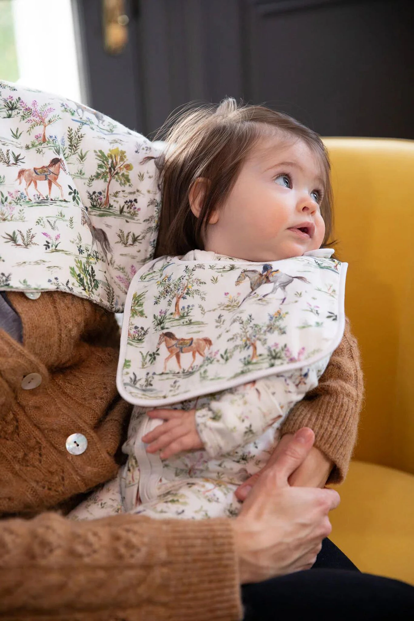 Beauty meets purpose, with the Horse Farm Bib and Burb Cloth Set. This coordinating set is constructed with a buttery soft cotton terry layer on the back and a beautiful printed muslin front, making it absorbent yet elegant. Perfect for mealtime or on-the-go, this adorable set ensures your little one stays clean and stylish.