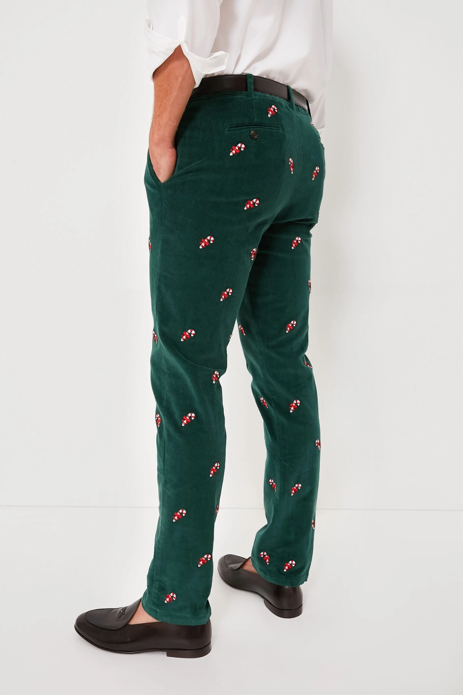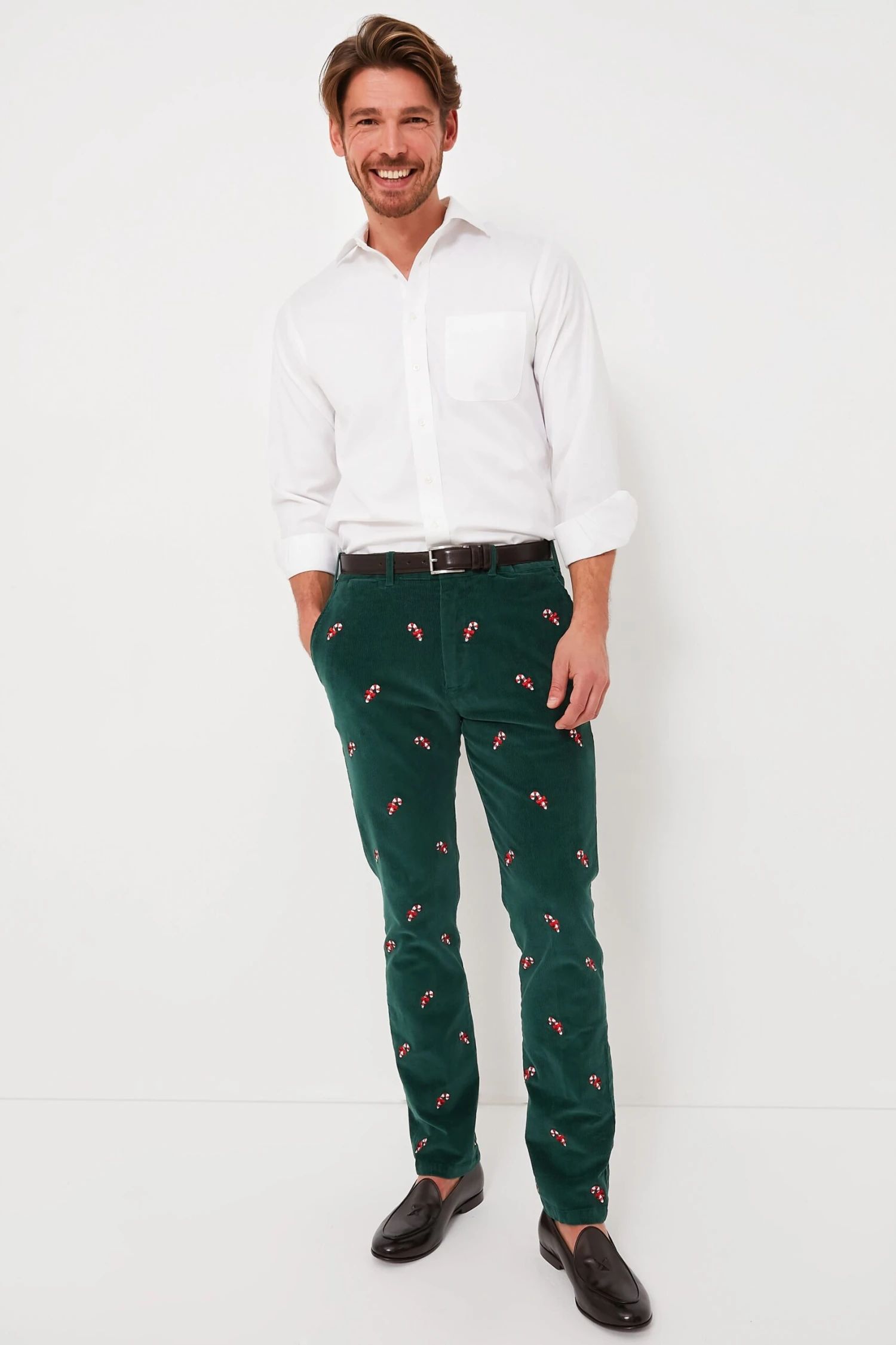 In a festive hue with a fun embroidered pattern, we are really loving the Hunter Green Candy Cane Pants this season, and we know you will too! Cut from a super comfortable corduroy fabric with a hint of stretch, these will keep you looking sharp and feeling even better. This pant plays well with a red gingham check shirt and navy blazer combo for an office dinner, or paired with a flannel and a quarter zip for the casual family party.