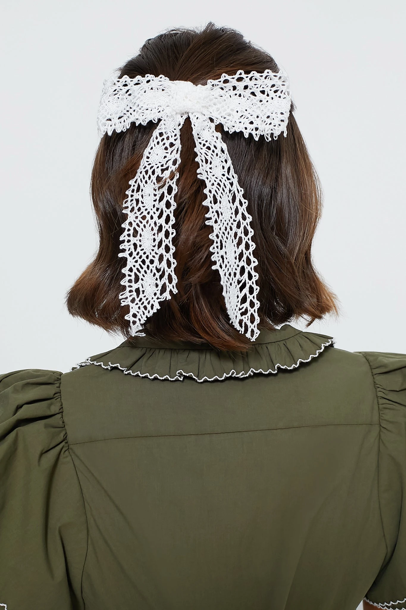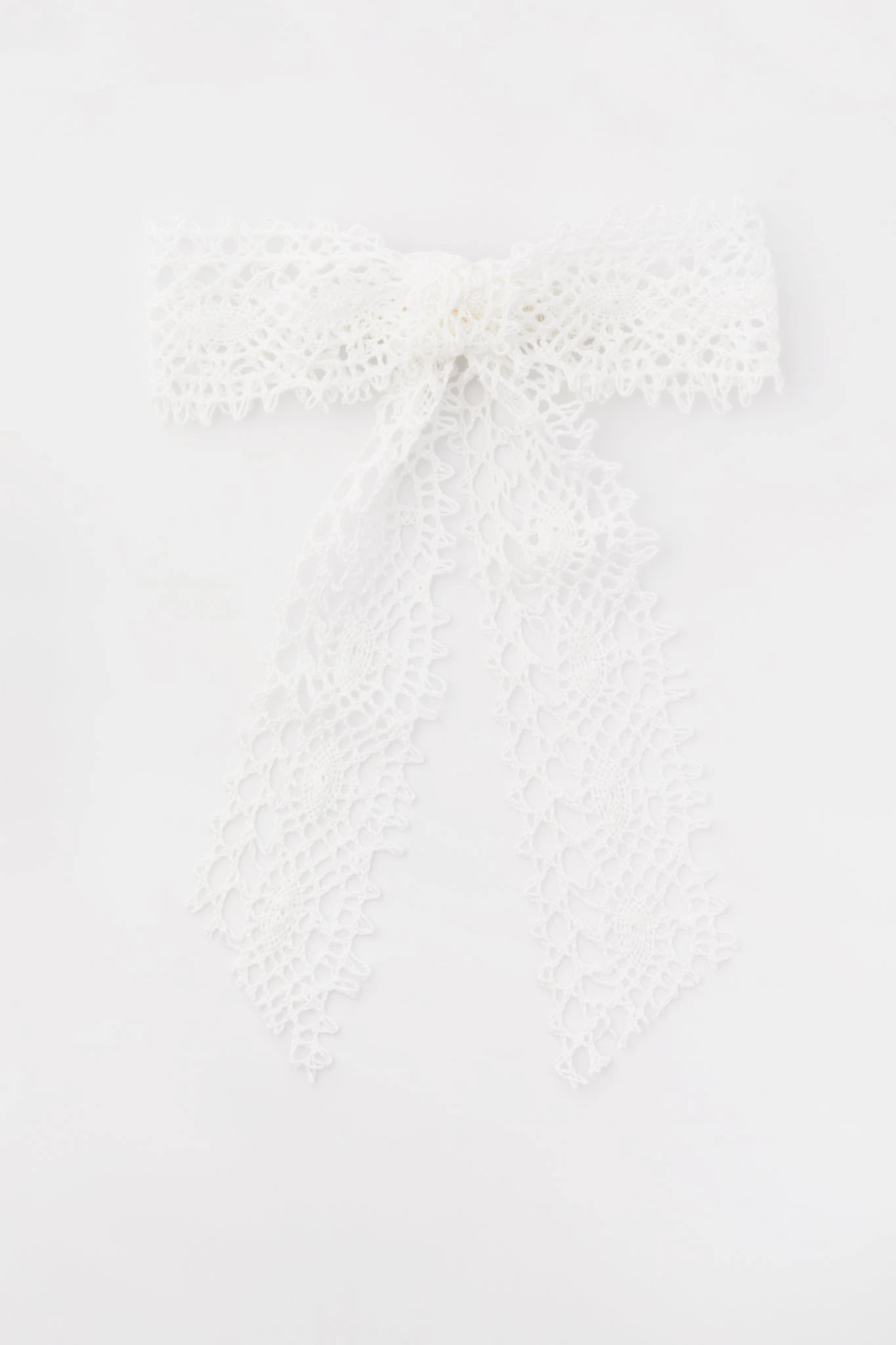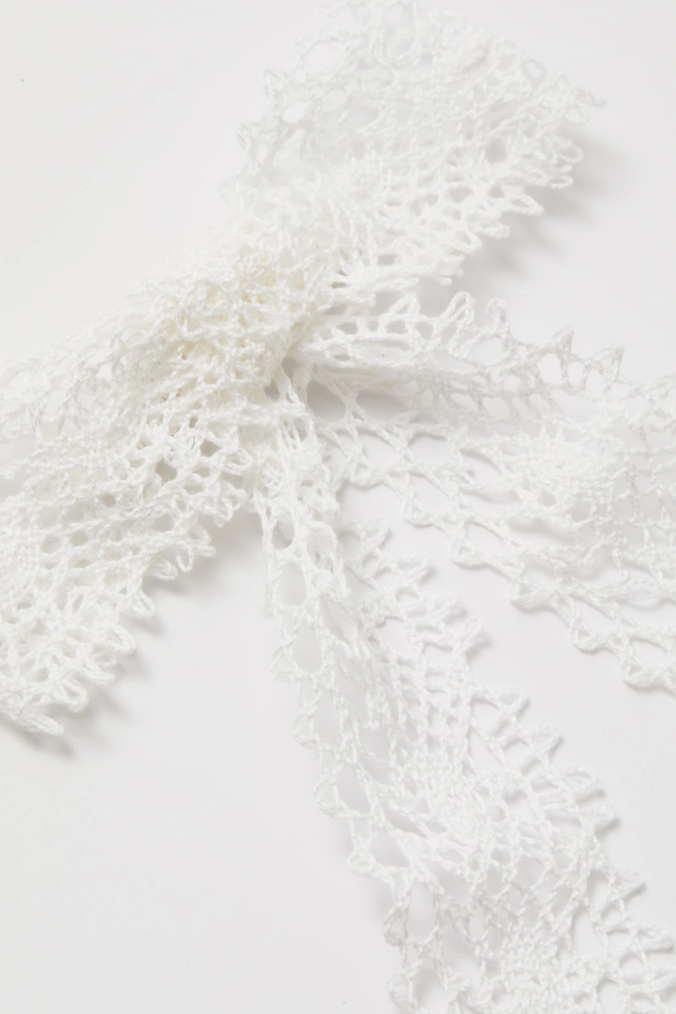 The Marbella Bow Barrette was designed in collaboration with Julia Berolzheimer, who was inspired to create a piece that she would be excited to slip into her hair on glorious summer days. This bow is crafted by hand in New York of vintage crochet ribbon from the 1960s. It’s finished with an automatic French barrette clasp, making it versatile enough to style a number of ways.