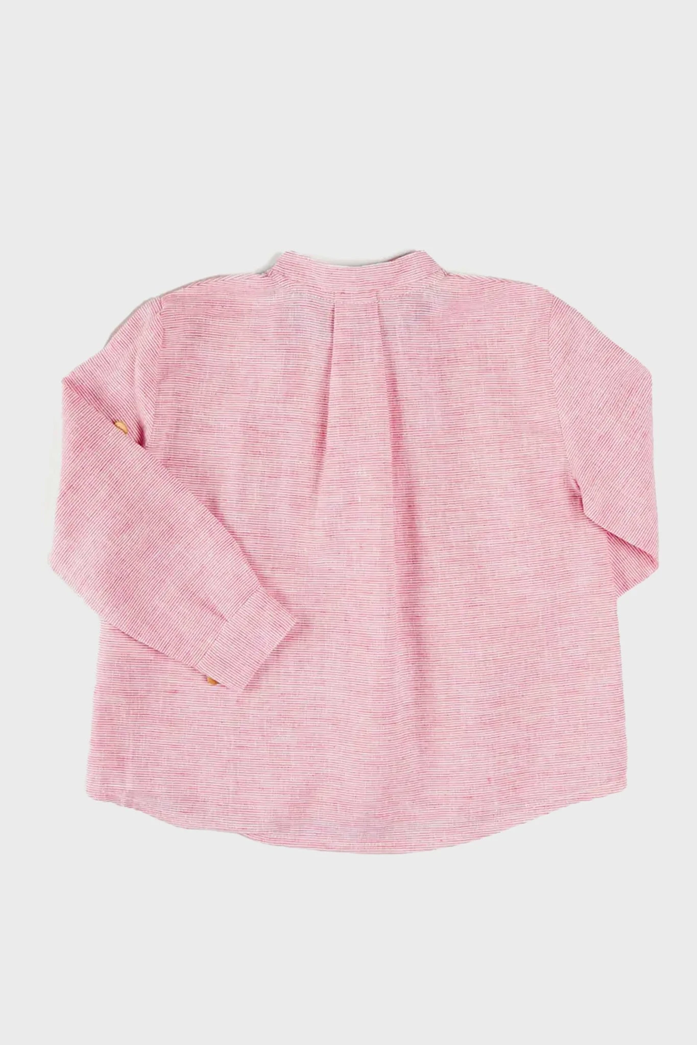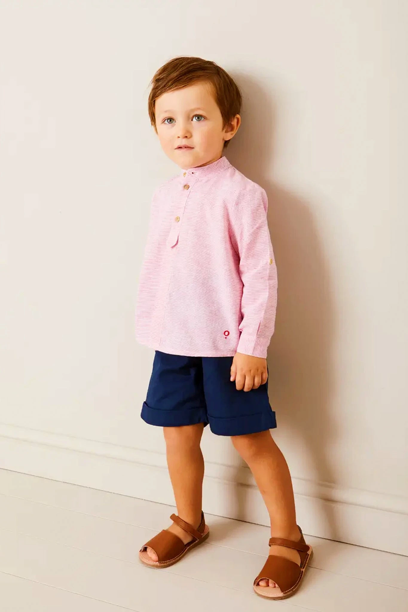 A timeless striped Mao collar long sleeve shirt in red, perfect for your little one. Crafted from 100% cotton, this shirt features bold Lawrence stripes and a classic Mao collar, combining traditional charm with modern comfort. The long sleeves offer warmth and style, making it a versatile piece for both casual days and special moments. Ideal for babies and children, it blends ease of wear with a touch of nautical elegance.