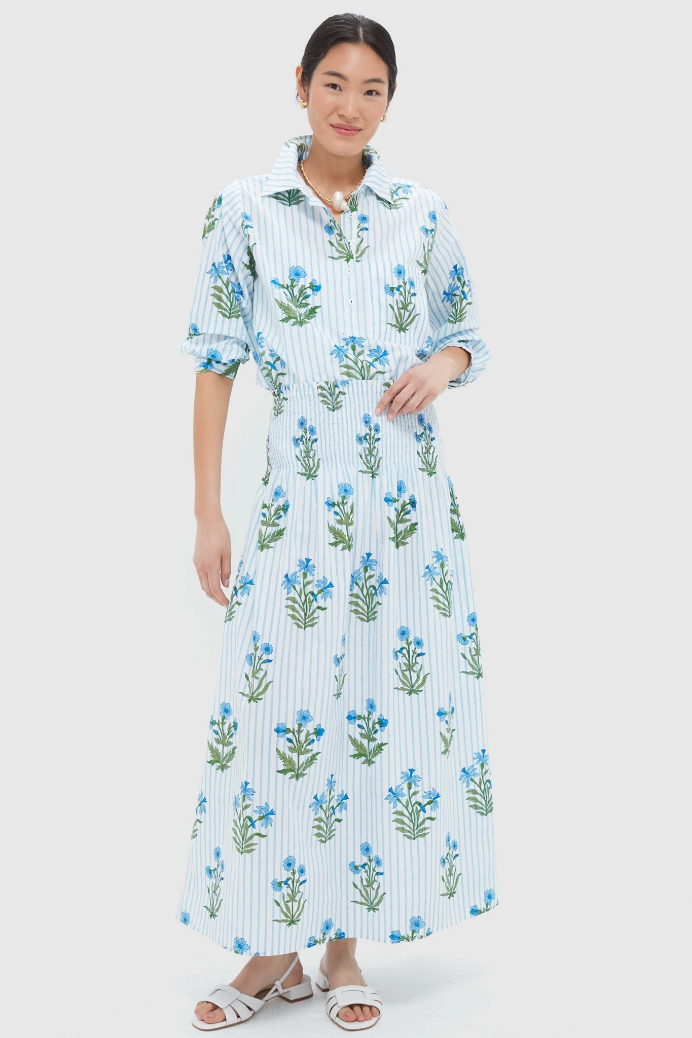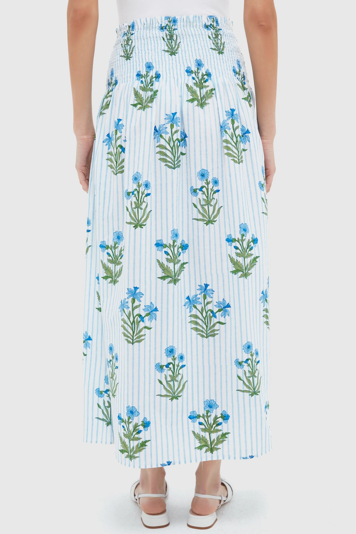Meet the multitasker your summer wardrobe needs— the Lily Stripe Alba Skirt. This smocked beauty works as both a flowy skirt and a strapless dress. Hand block-printed on soft organic cotton in blue and green vintage-inspired buta prints, it’s equal parts comfortable and charming. Pair it with a tank or the matching Alba Shirt for coordinated chic look.