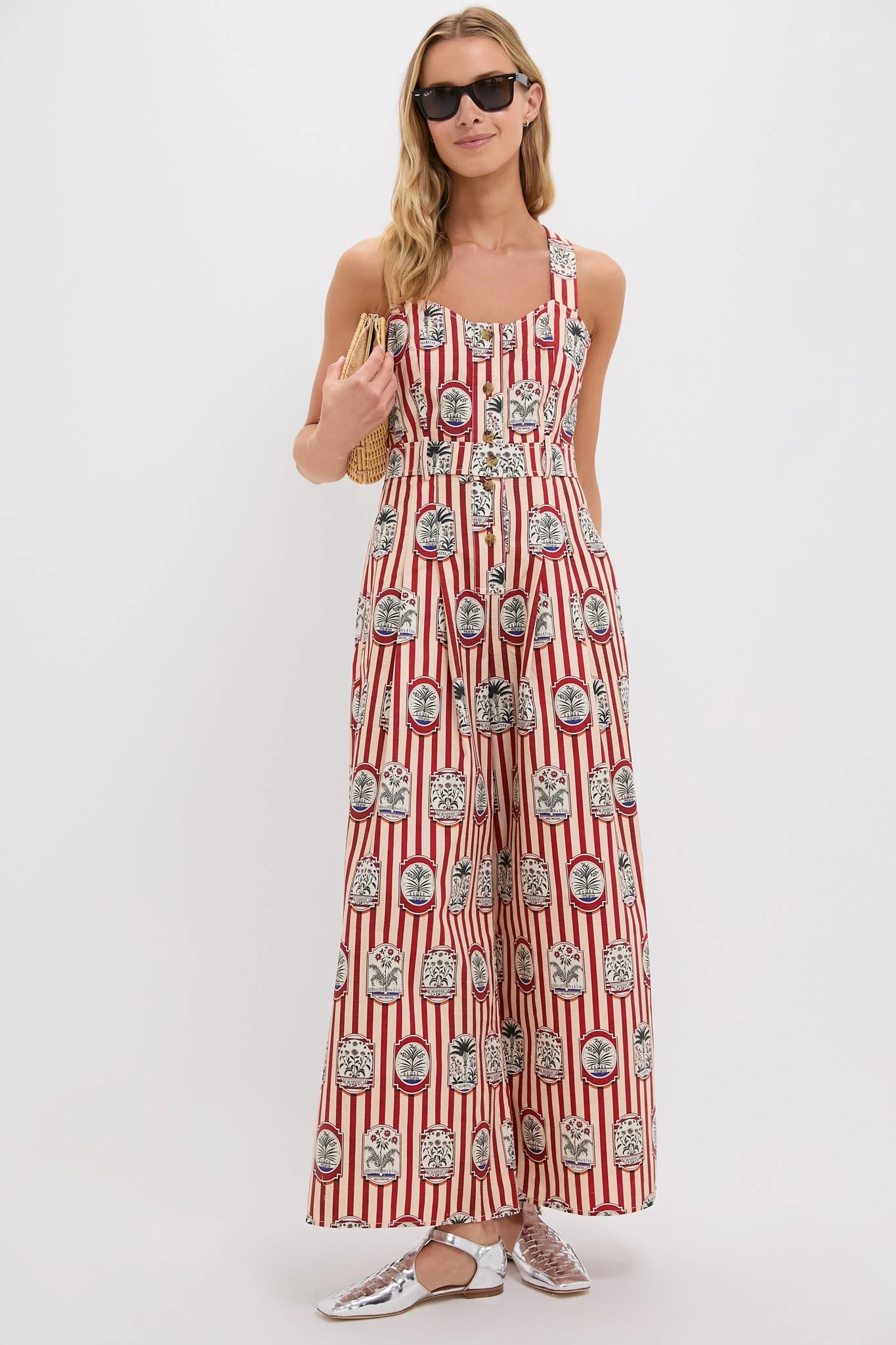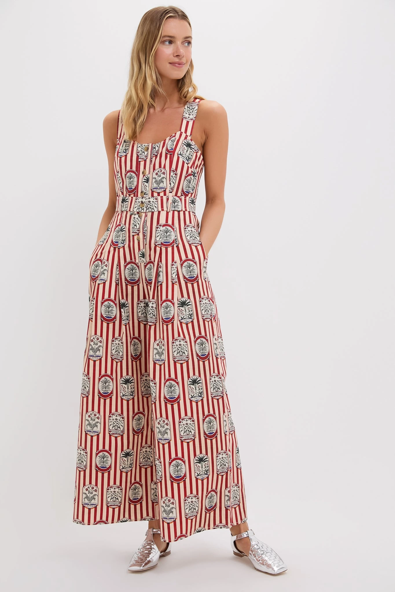 With a sweetheart neckline, cross-back adjustable straps, and a pleated wide-leg pant, this jumpsuit is equal parts tailored and effortless. Finished with a functional fabric belt, horn buttons, and side seam pockets, Sandy is your new go-to for polished ease with a playful twist.