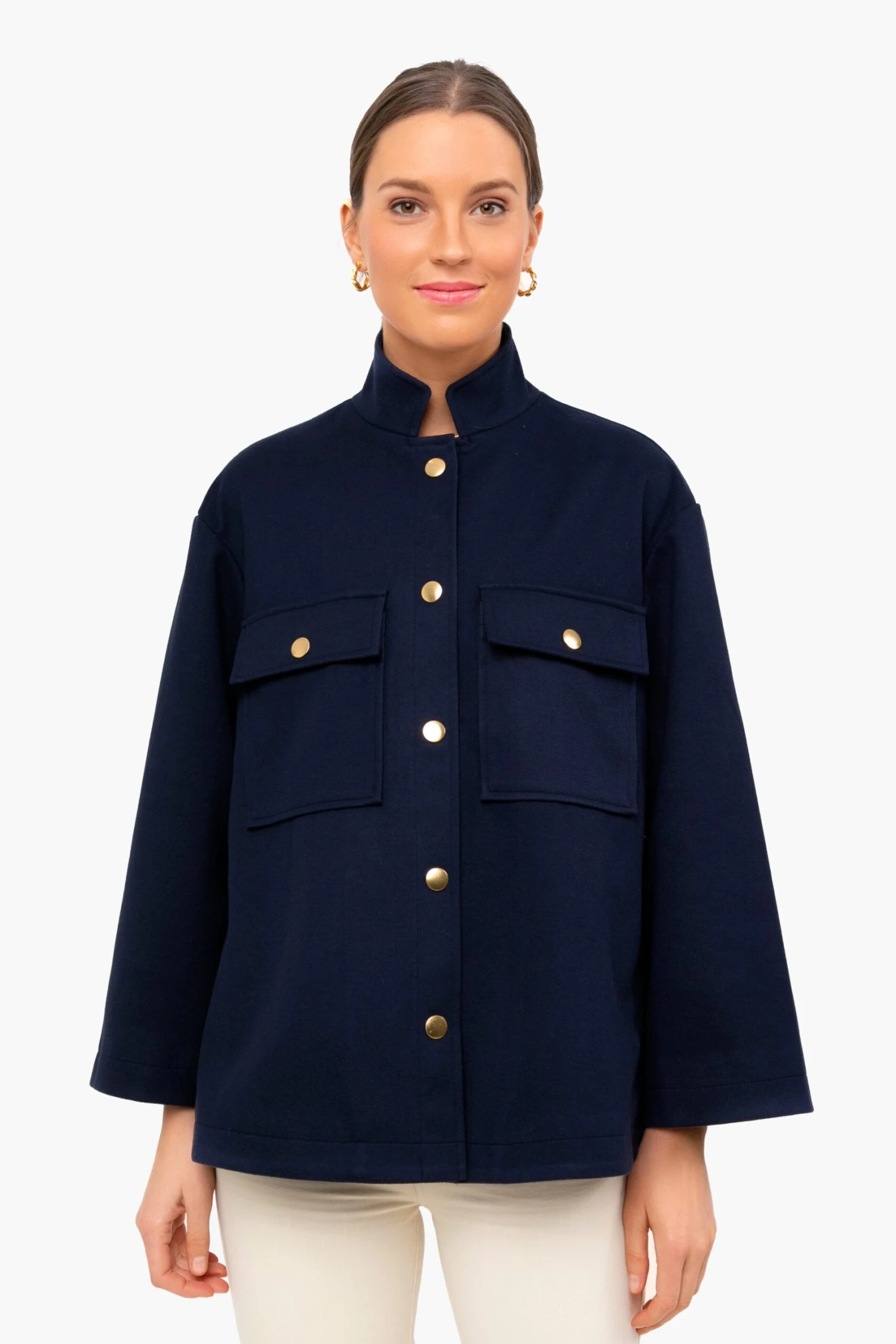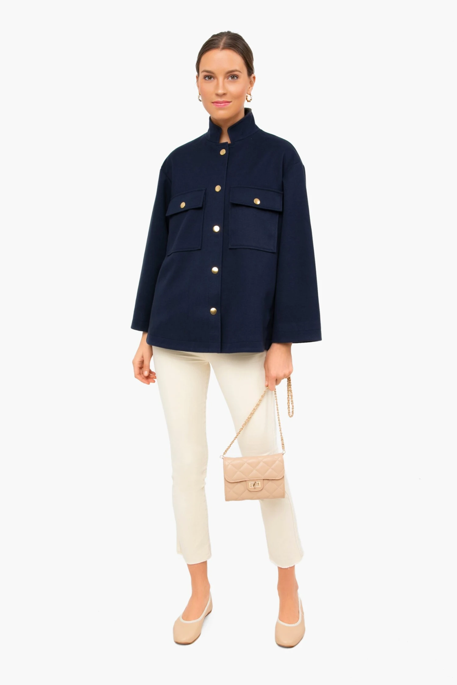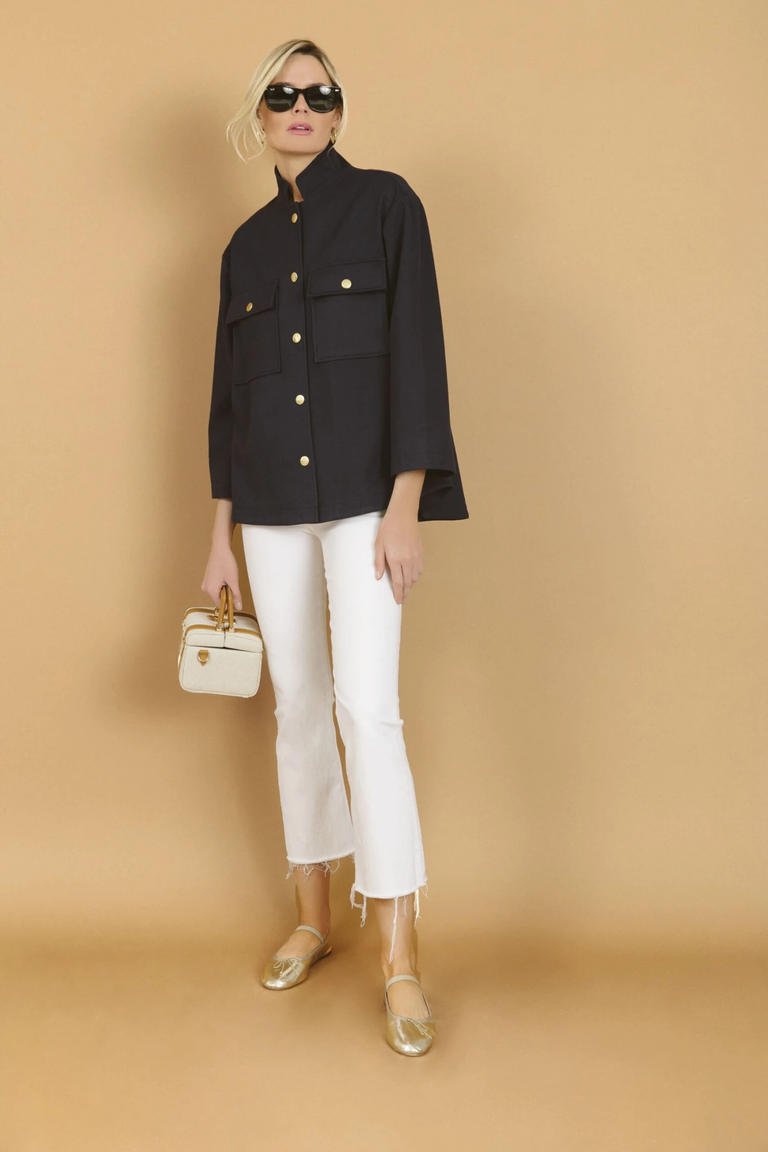 The Navy Marant Shirt Jacket is reminiscent of high fashion with minimalist and modern details. Featuring an A-line shape, stand collar, and gold buttons, this layer is effortlessly chic. From work to brunch, this neutral pairs easily with everything in your wardrobe all year long.