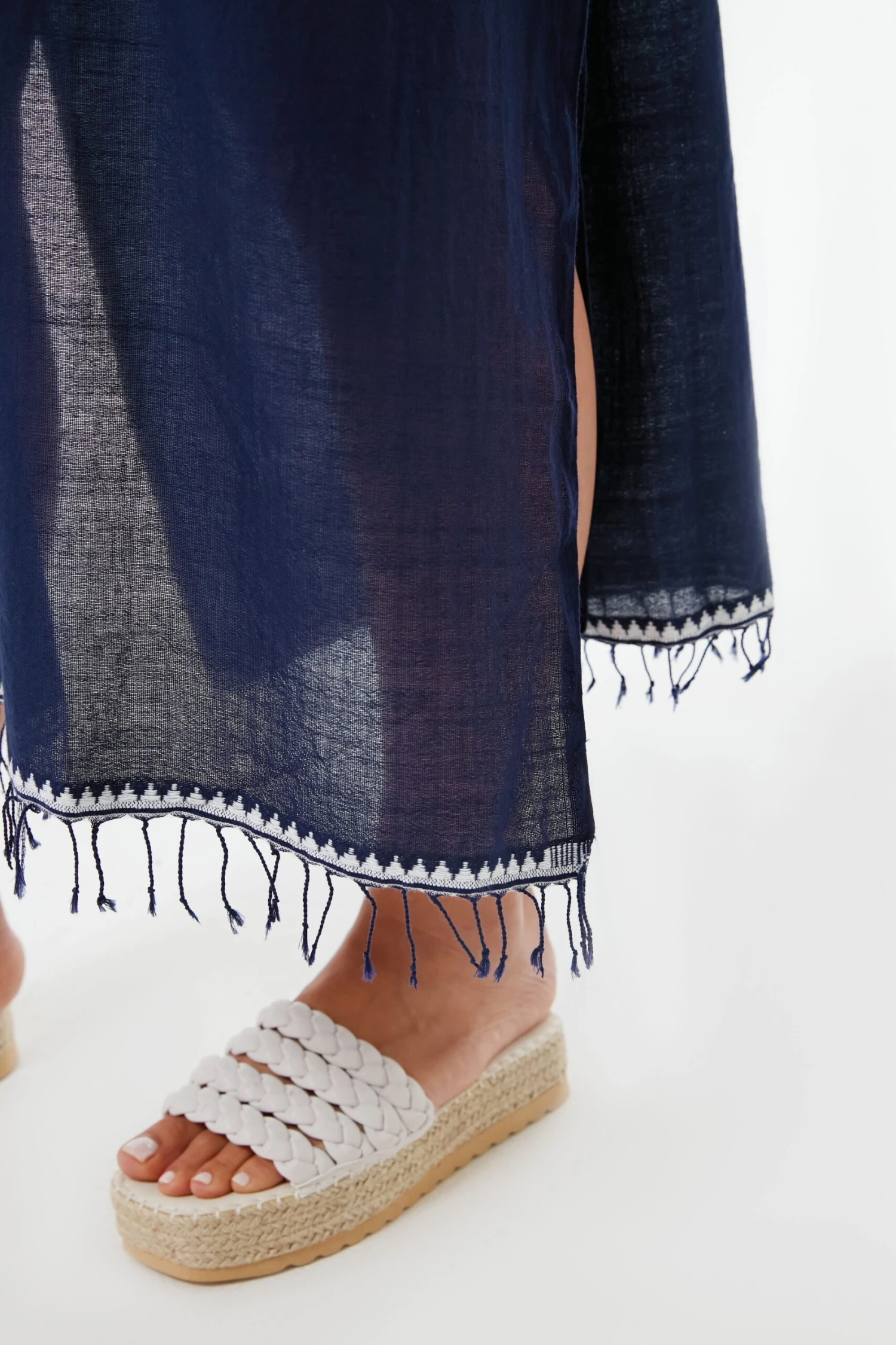 A quintessential resort style, we are loving the Navy Nunu Classic Caftan. With an ultra-wearable V-neckline, as well as breezy side slits and a fun fringed hem, this effortlessly elegant silhouette will keep you cool whether apres swim, lounging, or on the go. A powerful packing list item, this easy maxi can act as a coverup when worn over a bikini, or a casual dress when styled with sandals and statement jewelry.