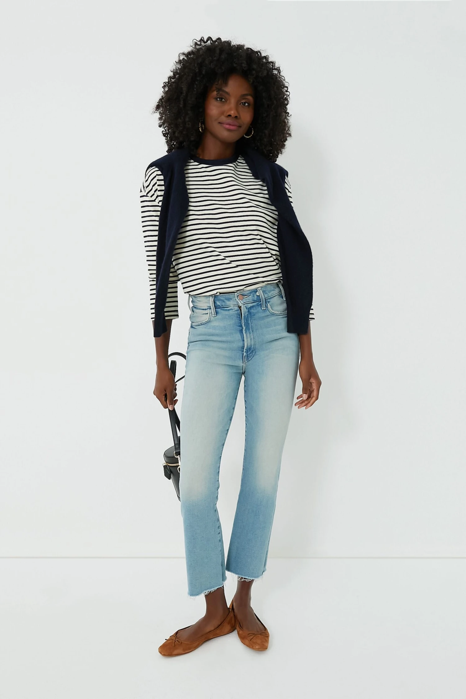 A sporty swap for your go-to t-shirts, the Navy Striped Knit Popover adds a little something extra to your dressed down days. Creamy whites and navy hues create a vintage feel while the modern stretch knit fabric and swing shape guarantees this to be in your wardrobe for years to come. We are pairing this with trousers and boots for running errands on low key days and adding a crisp button up underneath for a fun play on layering for brunch with friends.