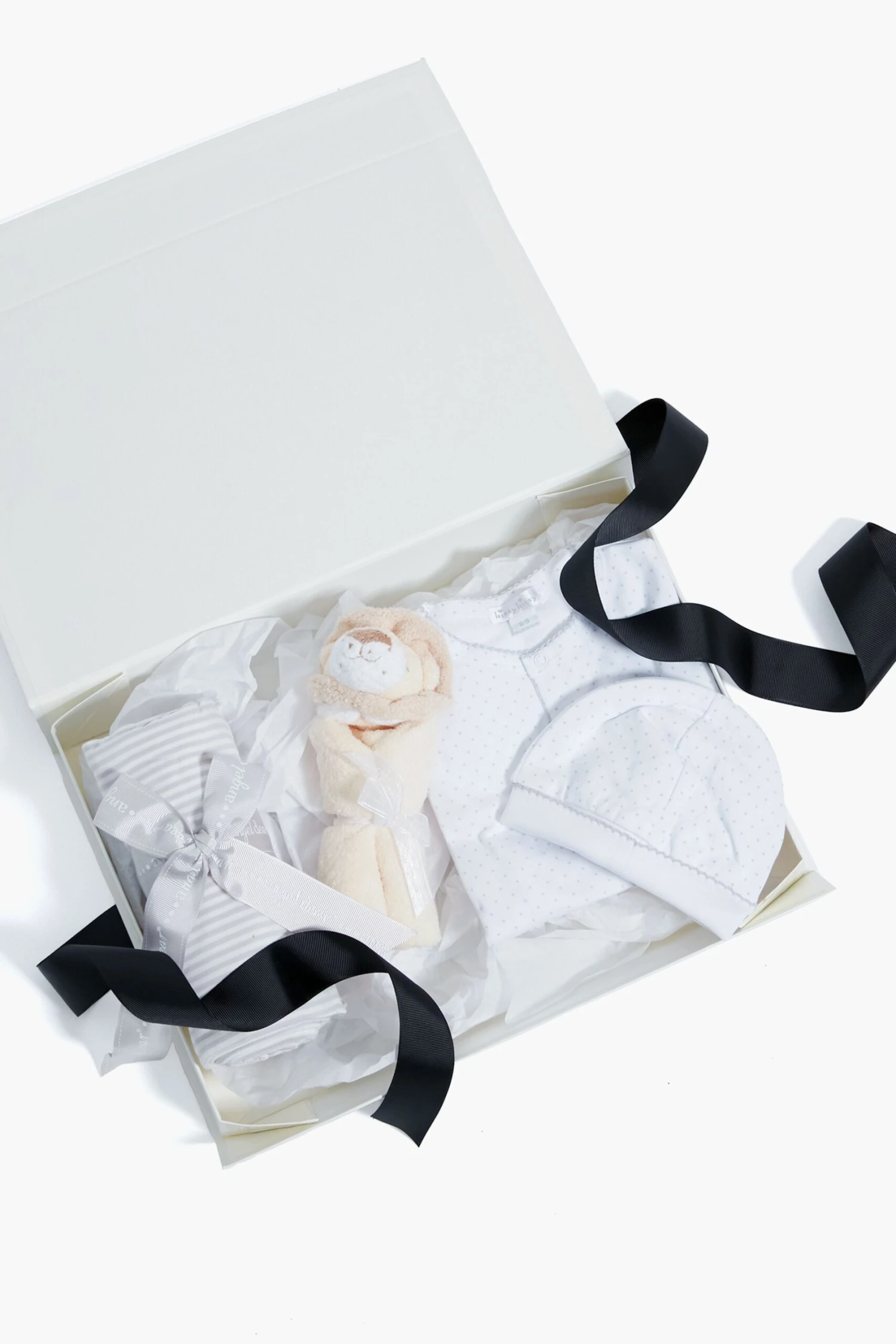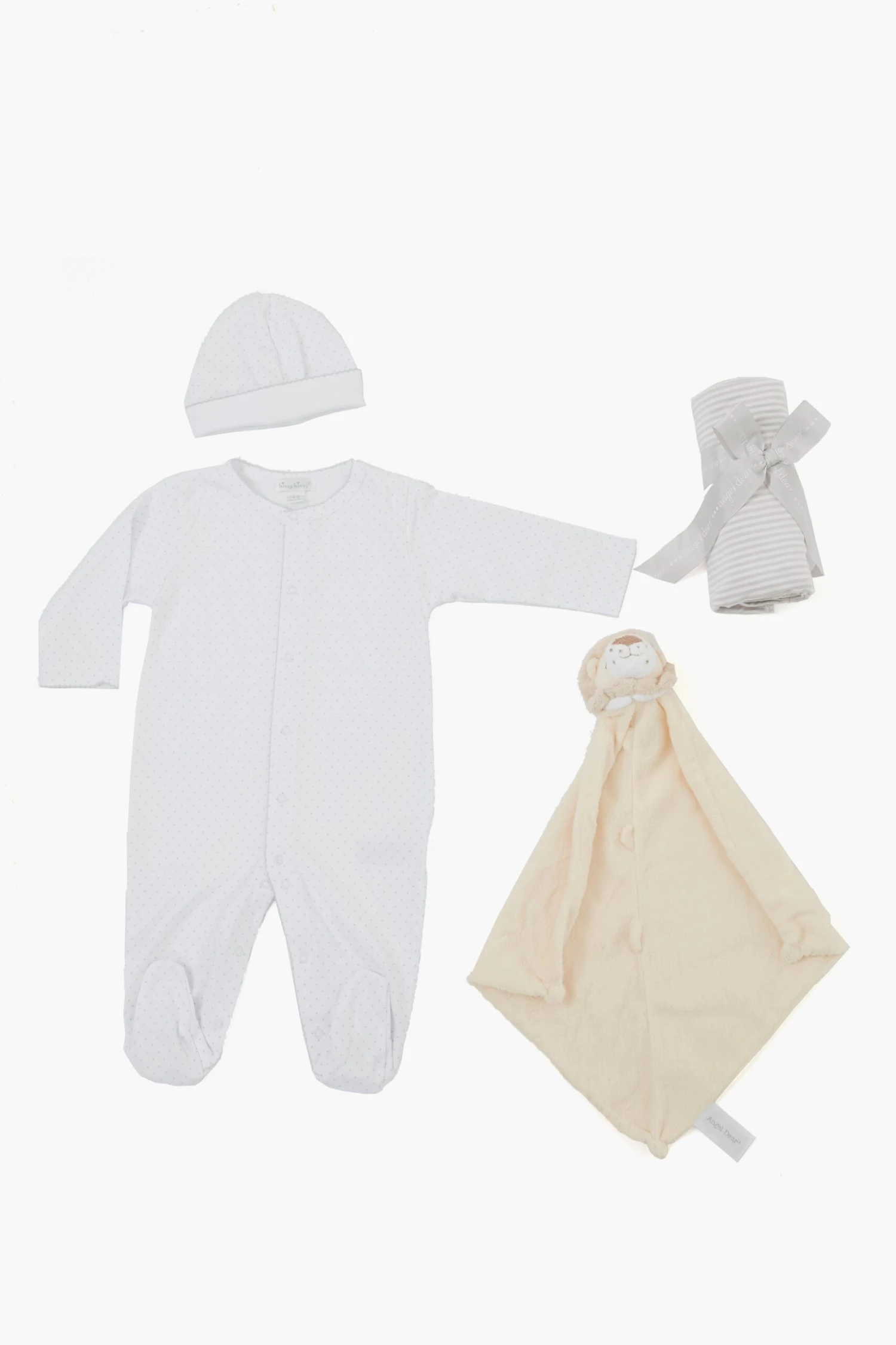 The New Baby Gift Bundle features pajamas, a hat, swaddle, and a lion lovie gift wrapped in a beautiful box. This is the perfect gift for a mother-to-be!