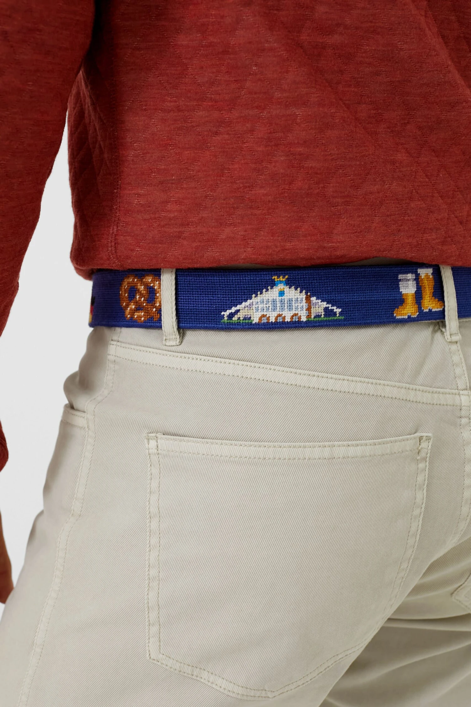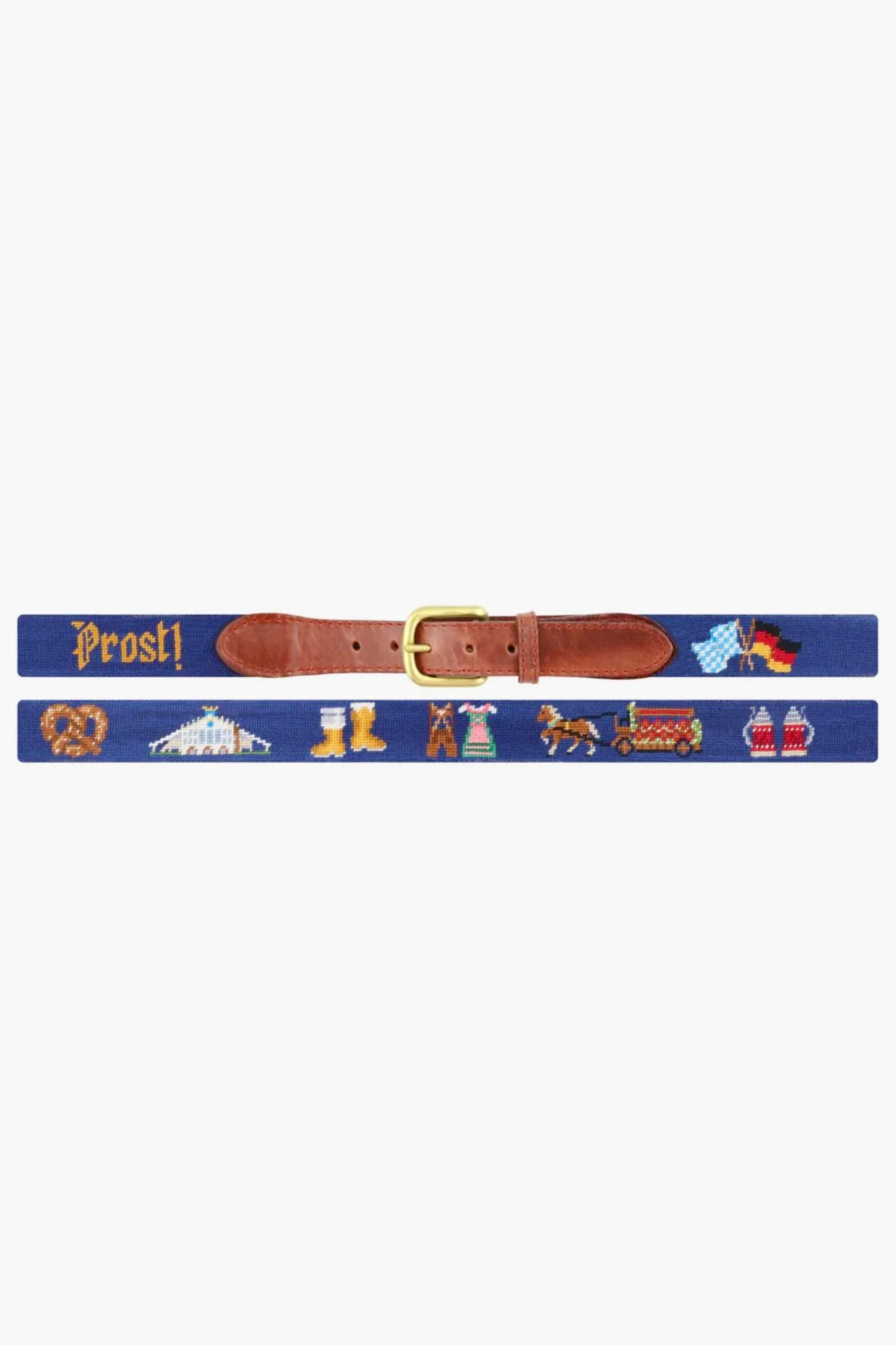 Prost! This Oktoberfest Life Belt is as festive as it gets- with needlepoint designs depicting Oktoberfest favorites, you are sure to be the life of the party this season. Pair with khakis (lederhosen optional), and get your pint ready to go!