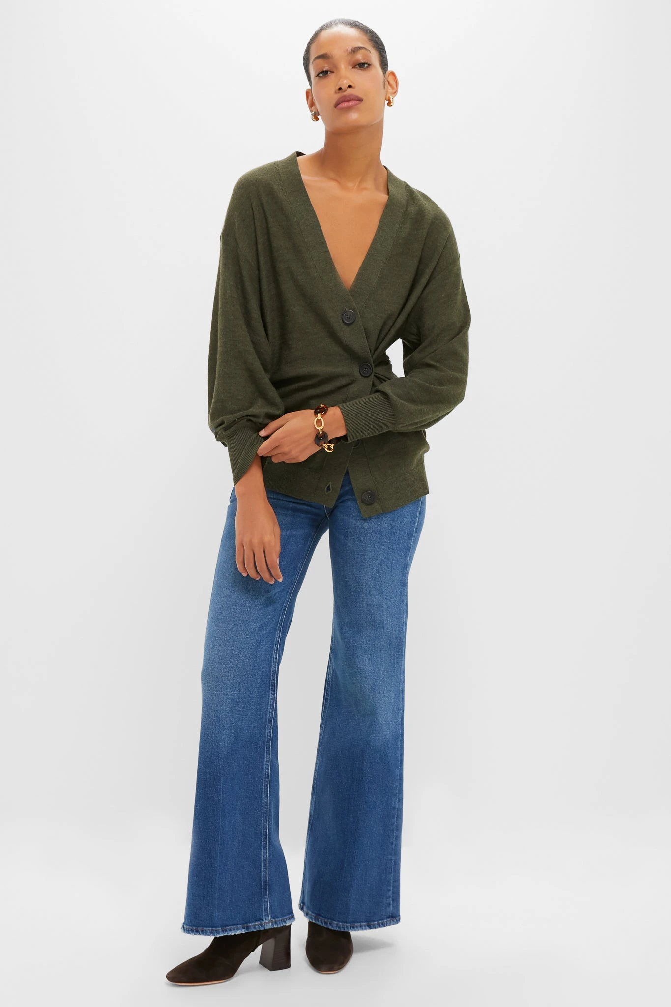 The lightweight layer we’re styling endlessly, the Olive Drippy Tissue Cardigan, designed with an extra button at the side waist that creates a cool cinch. Pair this cardigan with jeans, boots or flats, and a suede bag for on-trend, pre-fall wear.