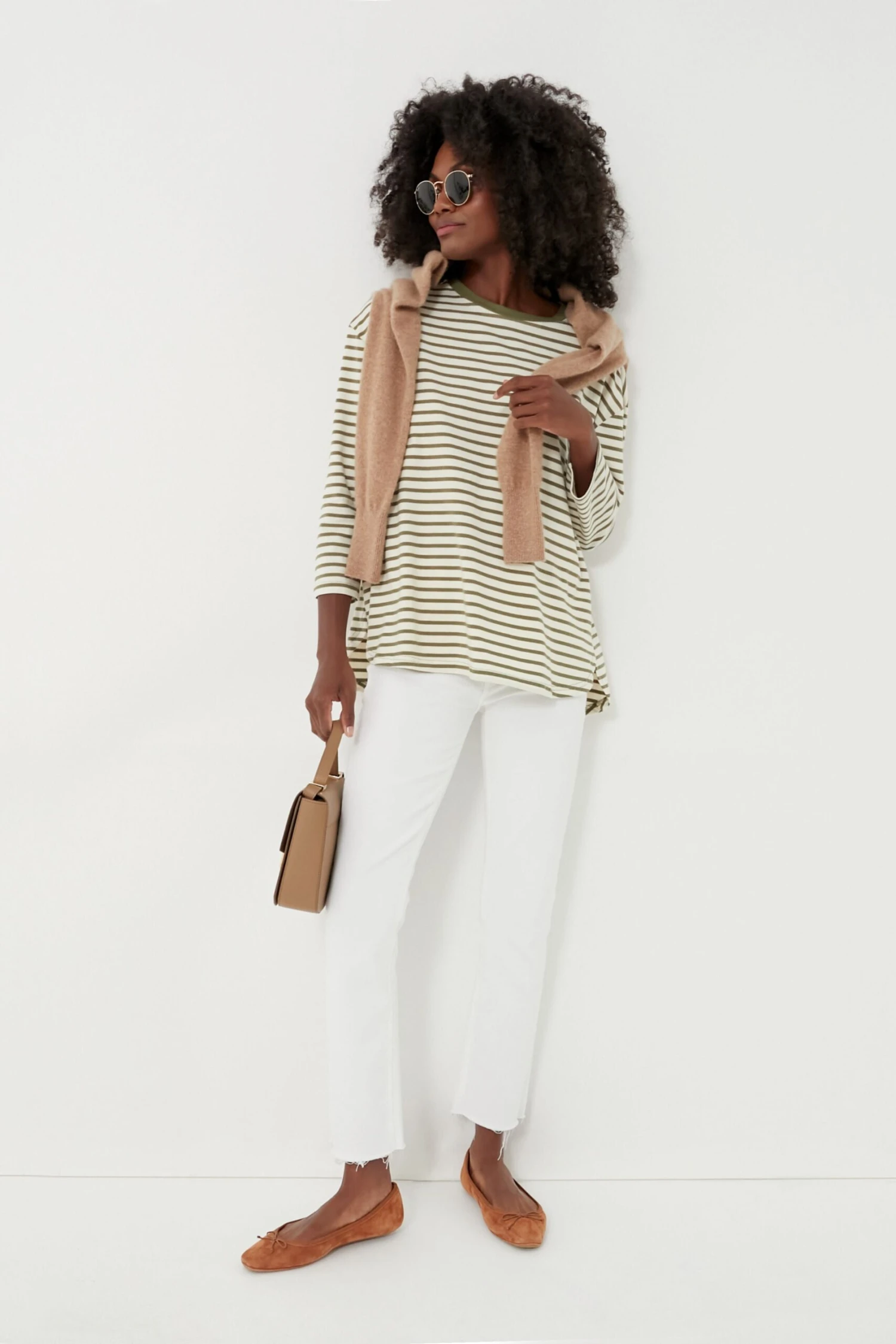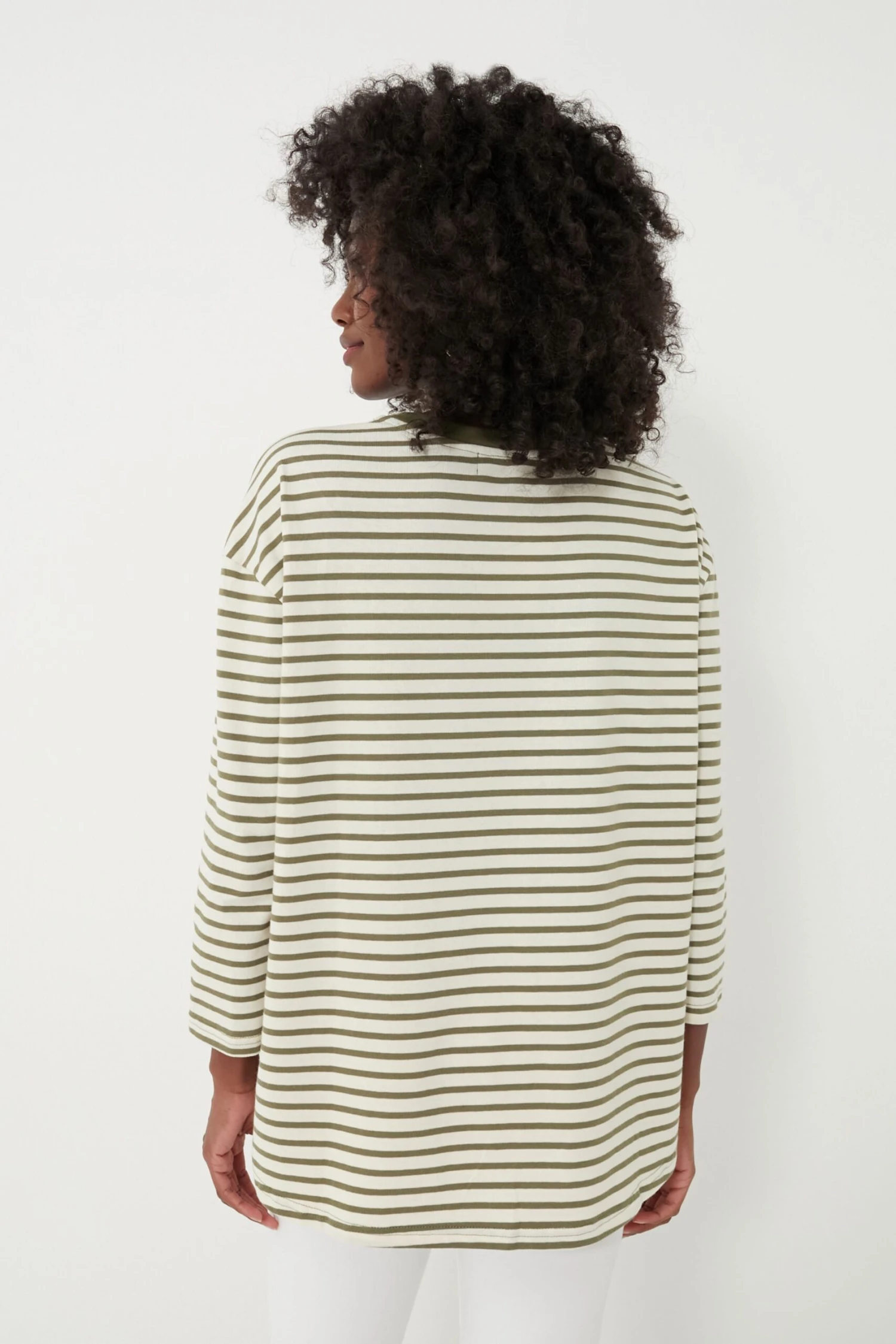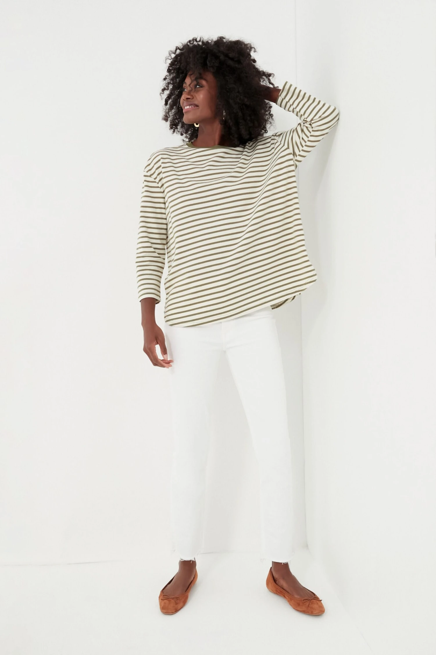 A sporty swap for your go-to tee, the Olive Striped Knit Popover adds a little something extra to your dressed down days. Cream and green hues create a vintage feel while the modern stretch knit fabric and swing shape guarantees this will be in your wardrobe for years to come. We are pairing this with denim, sneakers, and sunnies for lowkey days, and adding flats and a sweater over the shoulders for a fun play on layering for brunch with friends.