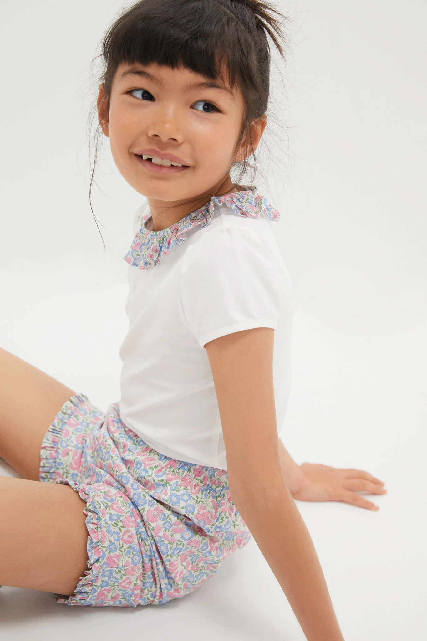 Indulge in the charming elegance of the Pastel Floral Top & Short Set. This adorable two-piece set features an ivory top with short sleeves and a delicate floral frill collar, plus a button opening at the back for easy dressing. Paired with matching floral shorts with an elasticated waist and frills at the hems, this set is perfect for everyday wear during the spring and summer. Comfort and style combined in one sweet ensemble.