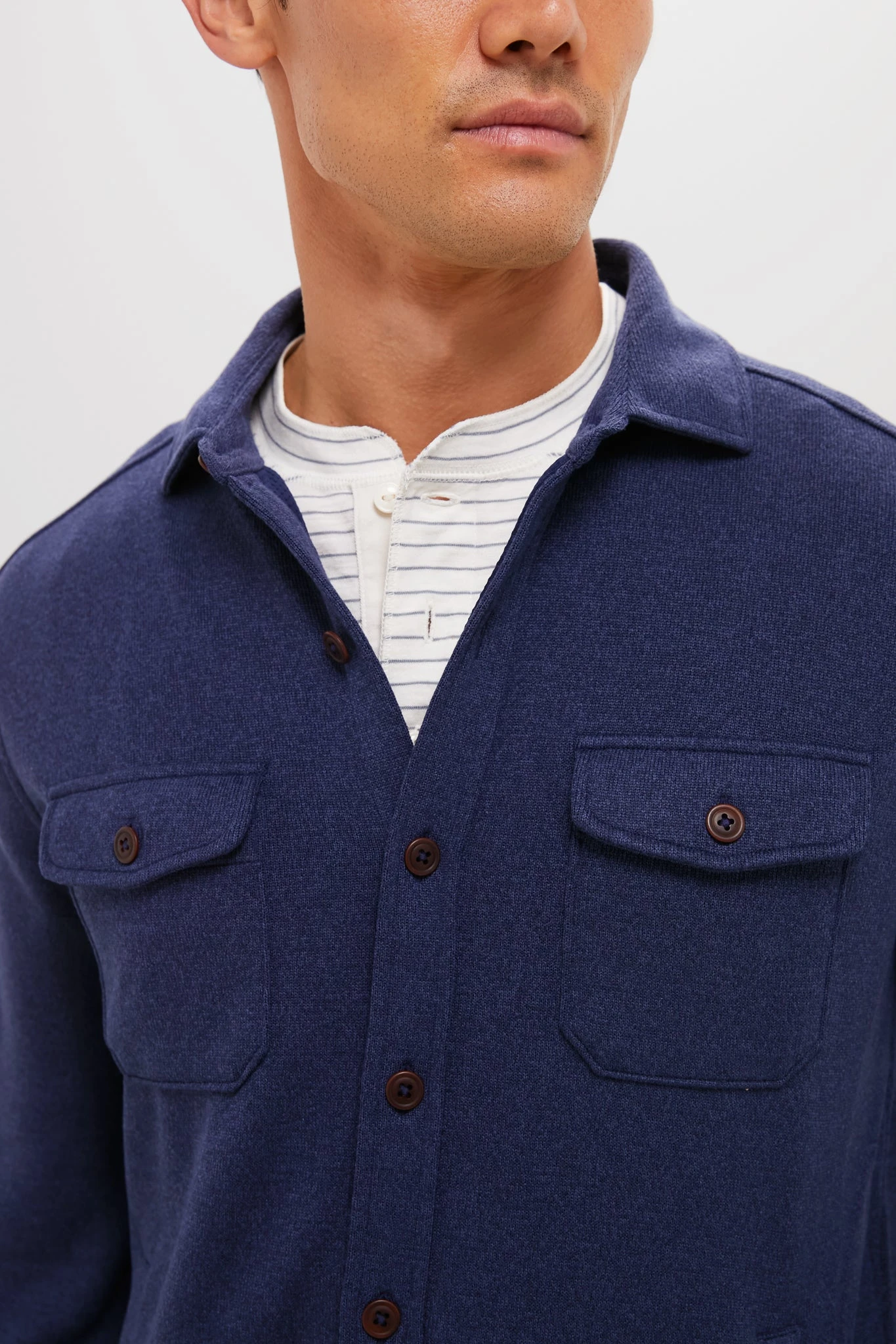 Classic fleece comfort meets versatile design in the Navy Crown Sweater Shirt Jacket. Crafted from incredibly soft recycled performance fabric that offers lightweight warmth in cool weather, this piece features a spread collar, a front button placket, and side slit pockets for convenience. Style with denim, a long sleeve tee, and sneakers for outdoor chilling around the bonfire or for a cozy brunch look.