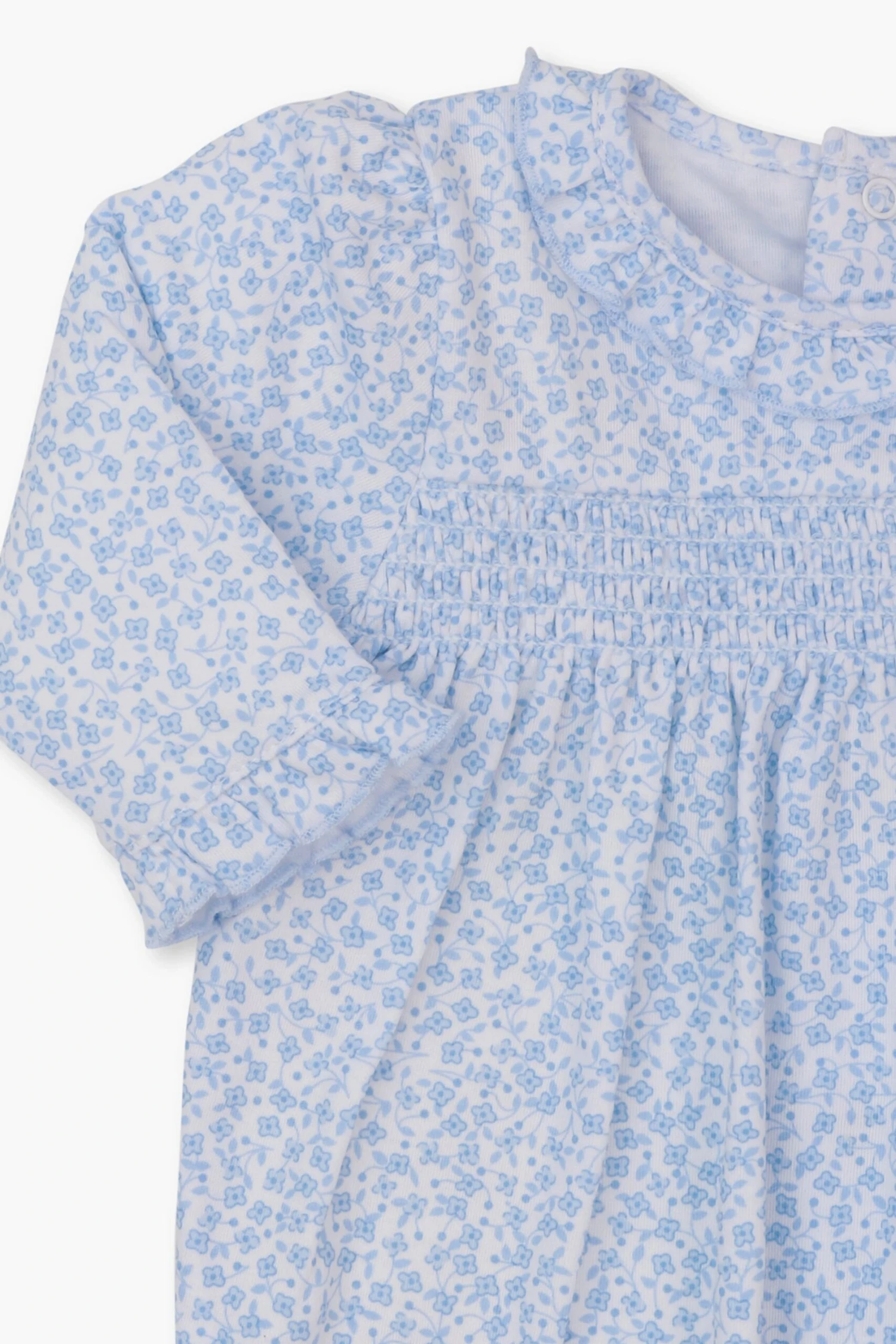 Ultra-sweet and covered in darling ditsy florals, the Petite Blooms Footie is a must-have for your little one! An effortless onesie style with a snap placket at the back for easy changing, this outfit features a ruffled round neckline, a smocked bodice, and adorable little attached feet. From cozying up at bedtime to early morning playtime, this is sure to be a winner.