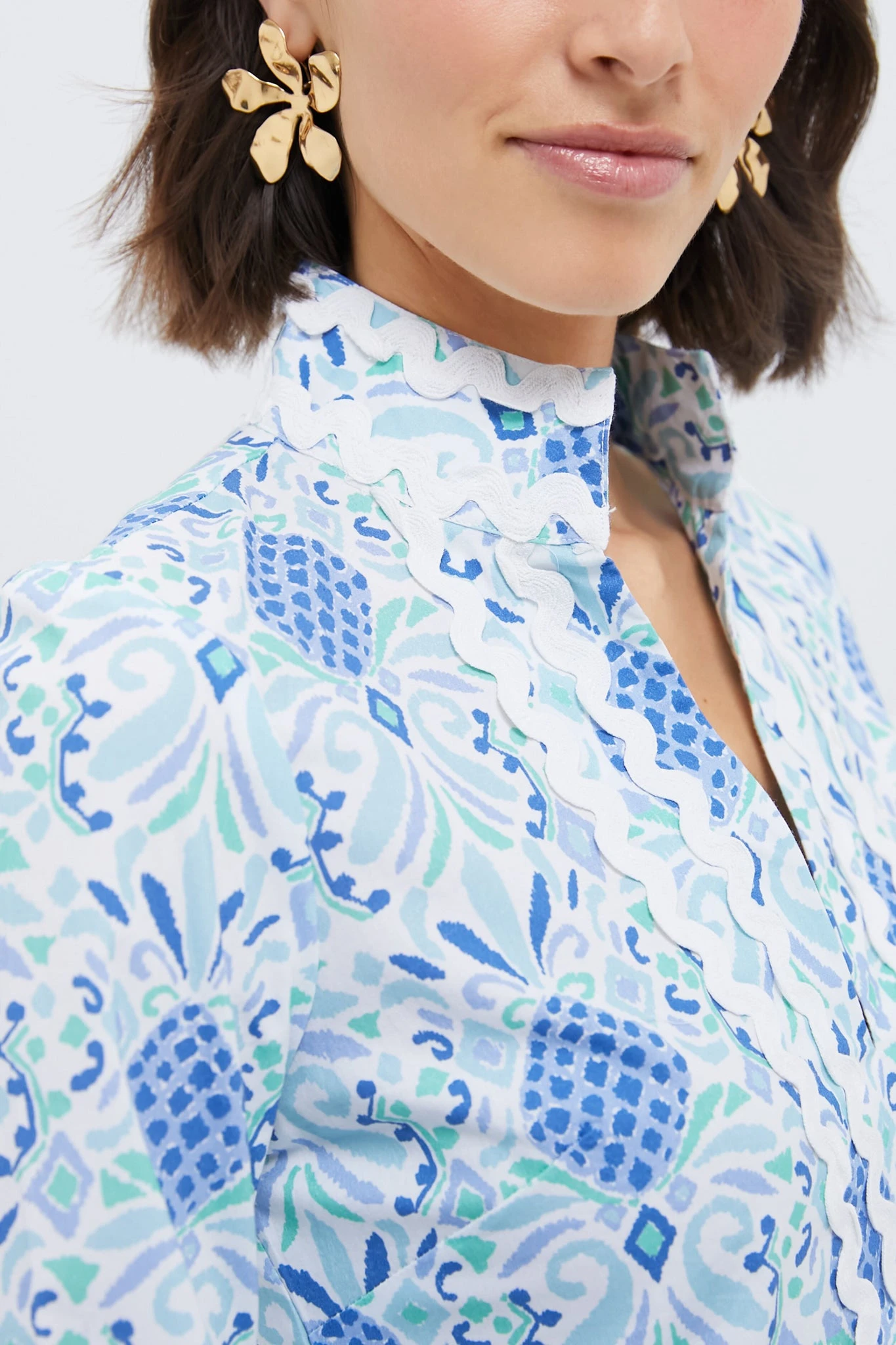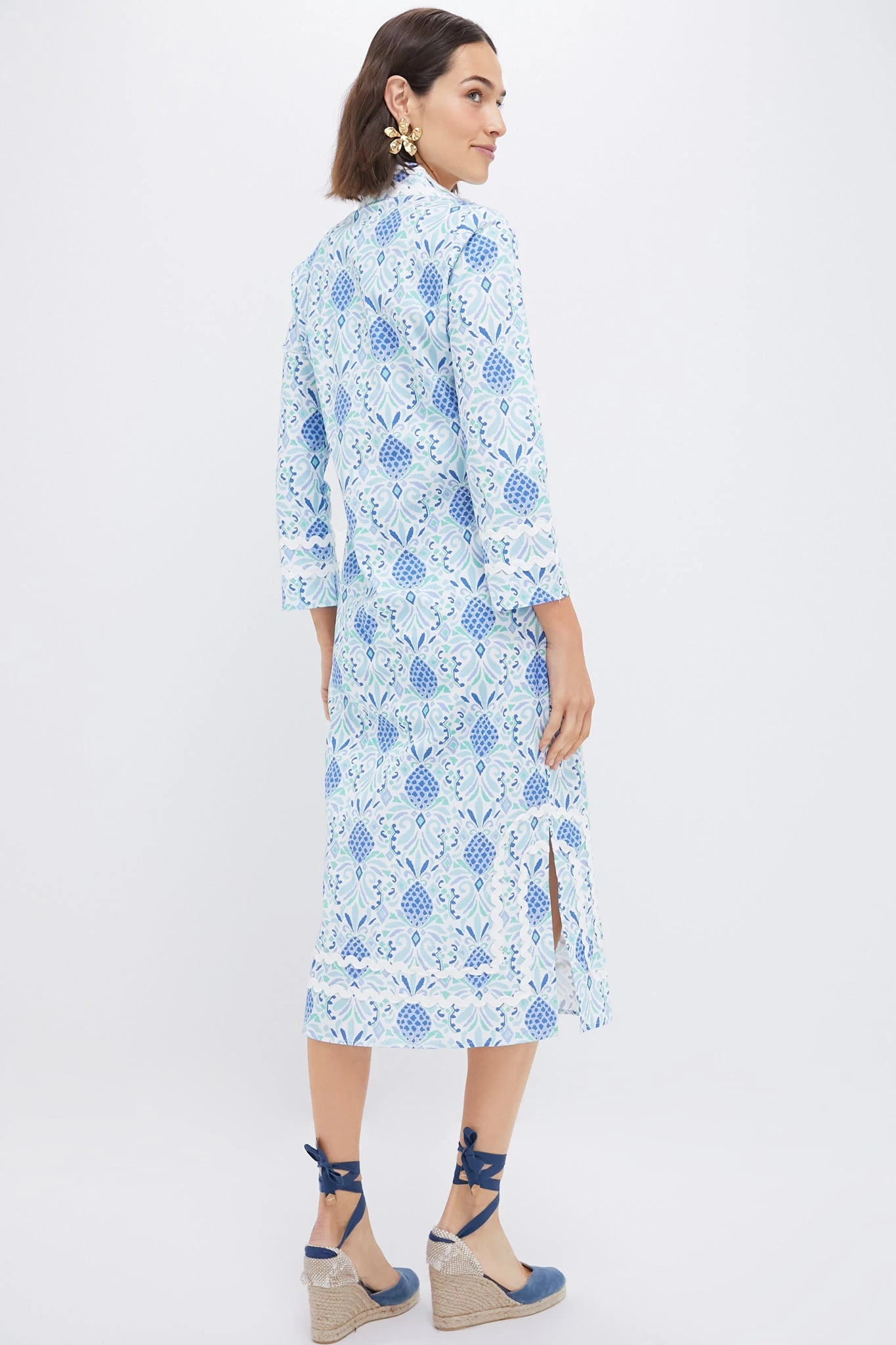 The Pineapple Print Longsleeve Classic Midi Tunic features a beautiful hand-painted print and ric-rac trim. We love the versatility of this breezy silhouette- throw it on over a bathing suit to meet up with friends at the Beach Club or pair it with an espadrille wedge and gold jewelry for an elevated game night evening at your favorite resort.