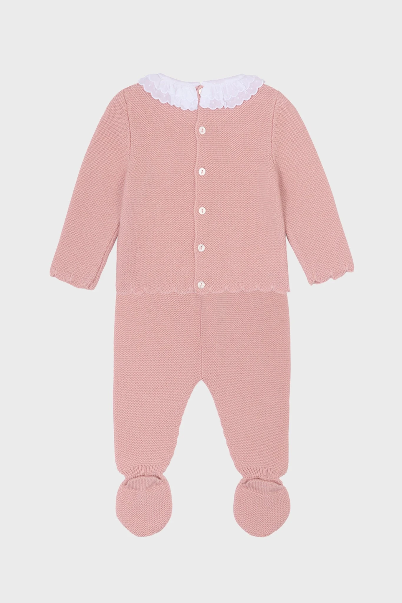 Crafted from a pure Merino wool in a fine gauge knit, this Pink Amaya Merino Baby Knitted Set features a relaxed fit with a comfortable round neck, and mother of pearl buttons to fasten at the back for easy changing. The matching trousers have long legs and an elasticated waistband with attached booties for extra comfort in colder climates.