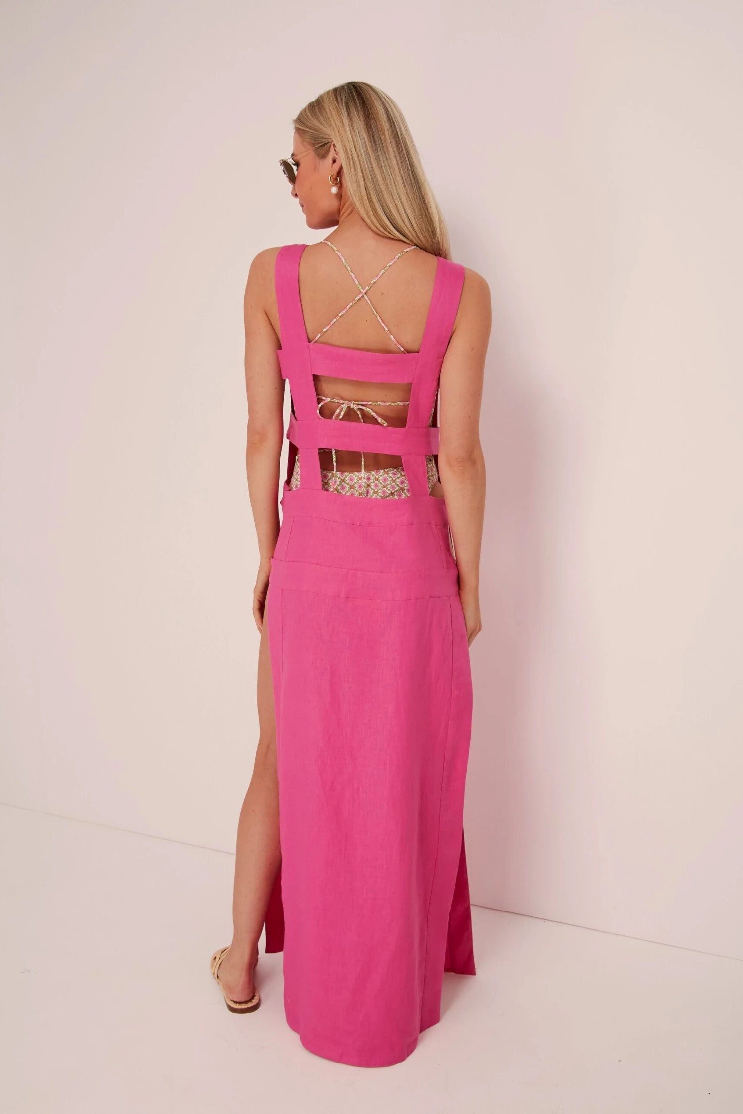 Talk about a glam, statement coverup! The Pink Solid Long Dress is here to help you show off some suntanned skin on your next warm-weather getaway. Cut from a breezy linen with open laddering details at the back and all down the side, this silhouette will have you feeling cool and looking even better. Layer this sultry style over a bikini to grab a mojito from the beach bar, or relax in it all day by the pool with a sunhat and sandals.