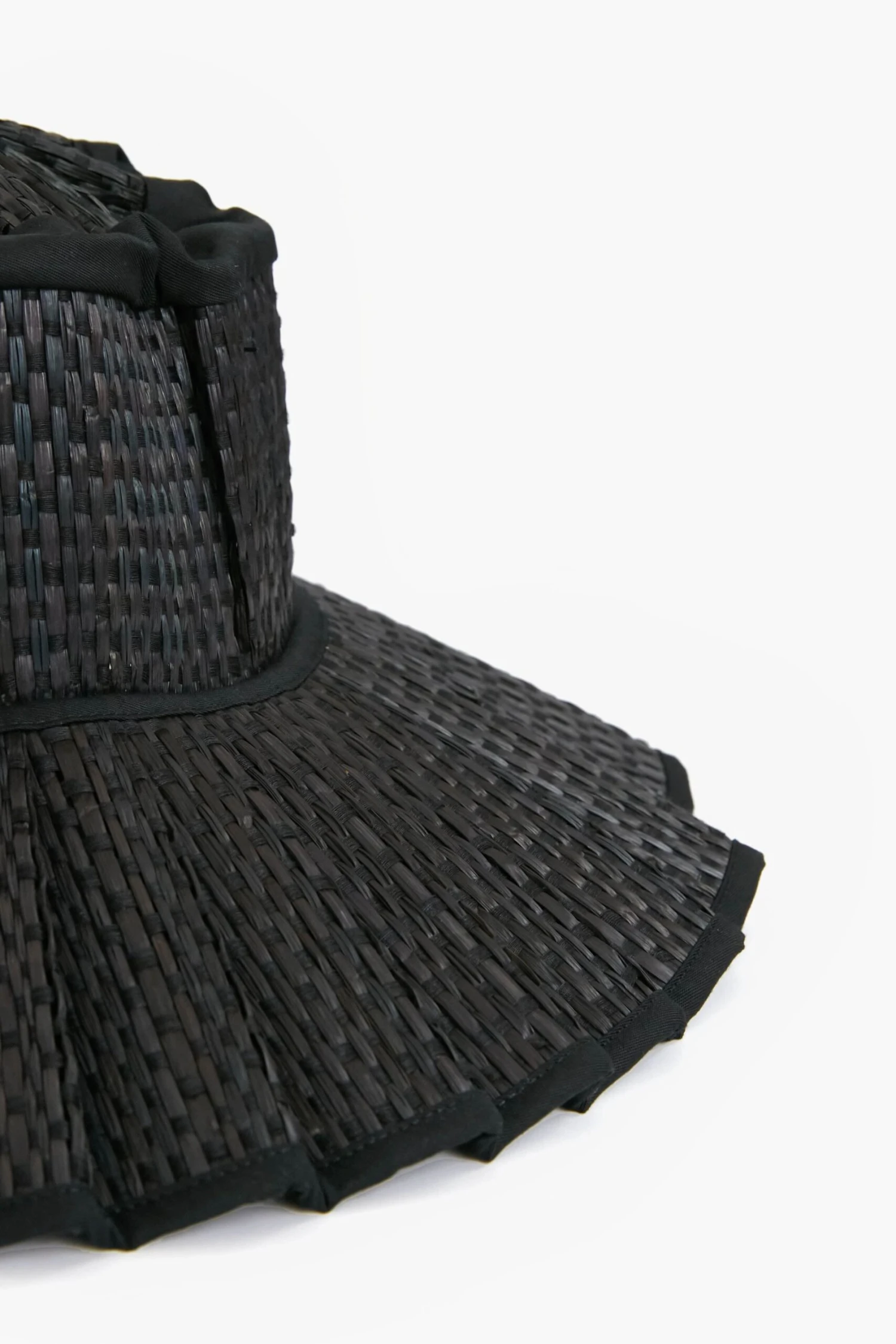 The Positano Capri Hat features ink black colored thread woven horizontally through a licorice-black, hand-dyed fiber base. This hat combines style and sun-safety with certified UPF 50+ protection and optional ties to keep it in place during beach breezes. This piece can be easily folded, making it perfect for your many adventures- just add a caftan and sandals!