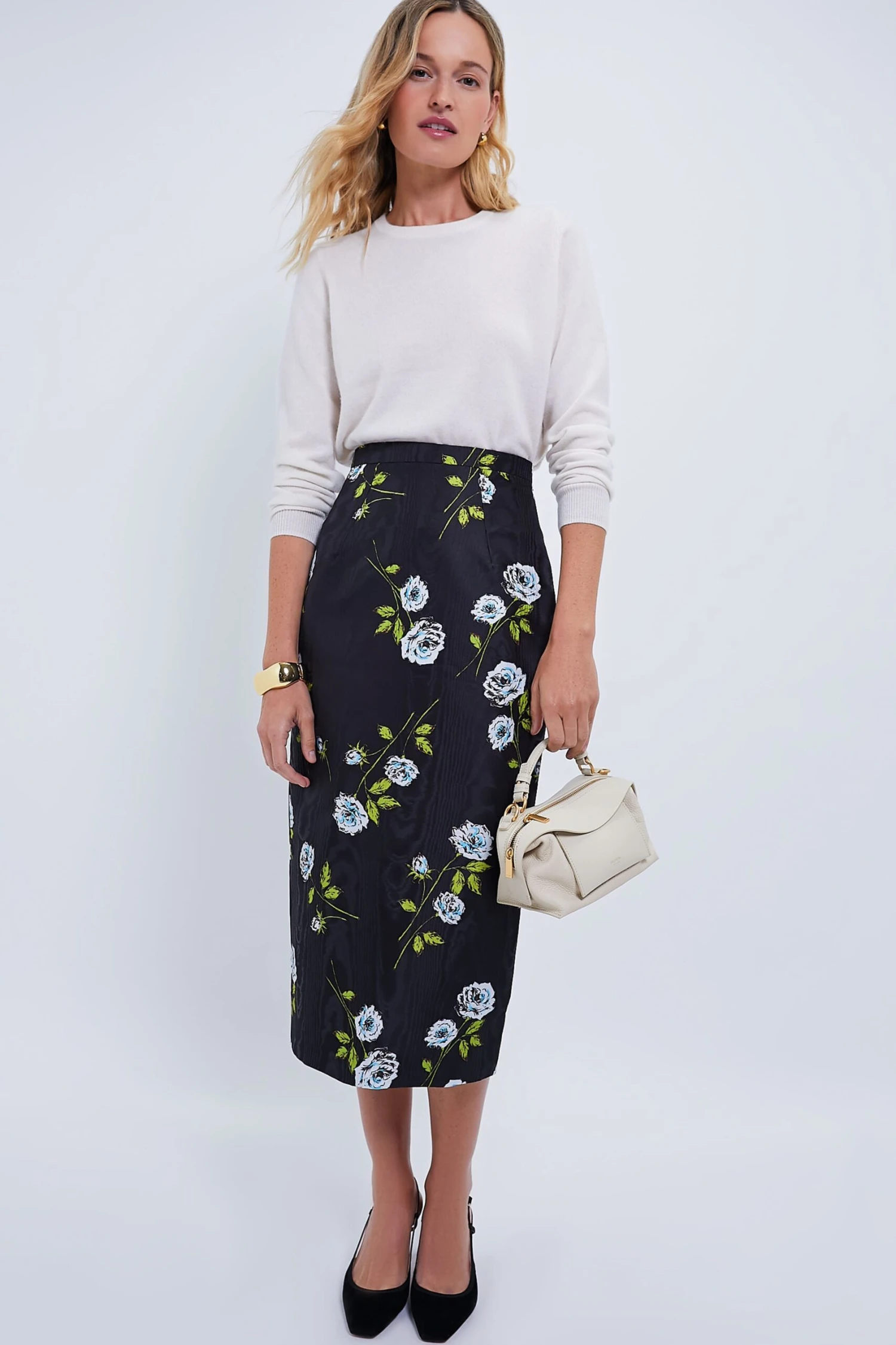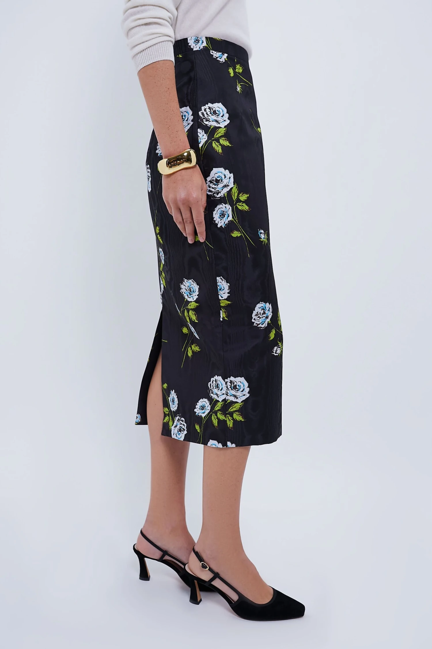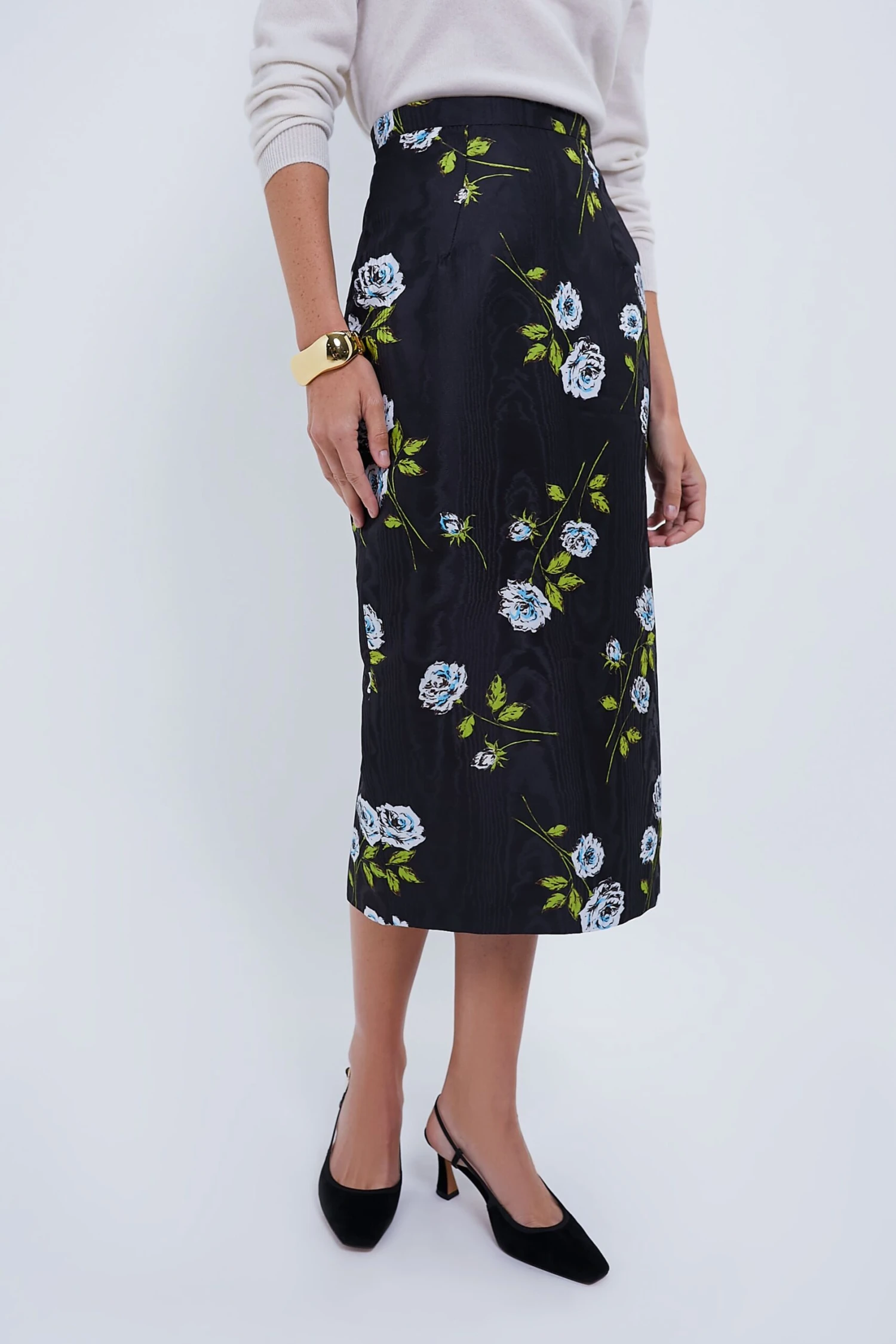 The Lorelei pencil skirt follows the Emilia Wickstead feminine tailoring, featuring a black moire base adorned with a delicate white rose stem flower motif print. With its high-waisted design, wide waistband, and back vent, this skirt exudes sophistication and grace, offering both style and comfort for any occasion. Pair with a white button down or body suit and heels for any and all formal occasions.