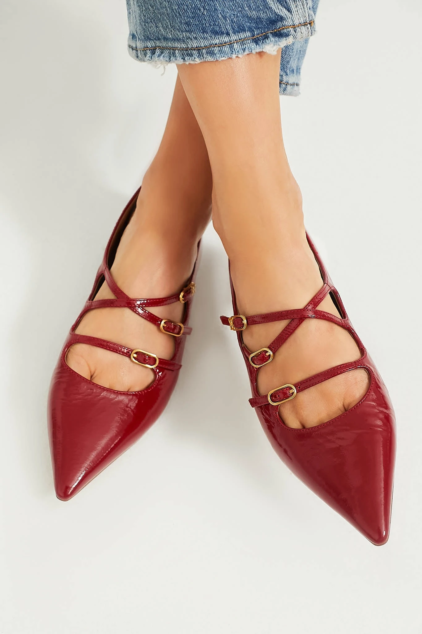 Equal parts cool and chic, Deep Scarlet Cass Flats are the definition of style. Featuring a pointed toe, criss-cross arch straps, and a rich red due, these will make a statement with any outfit. Pair with denim and a simple white tee or an LBD and blazer.