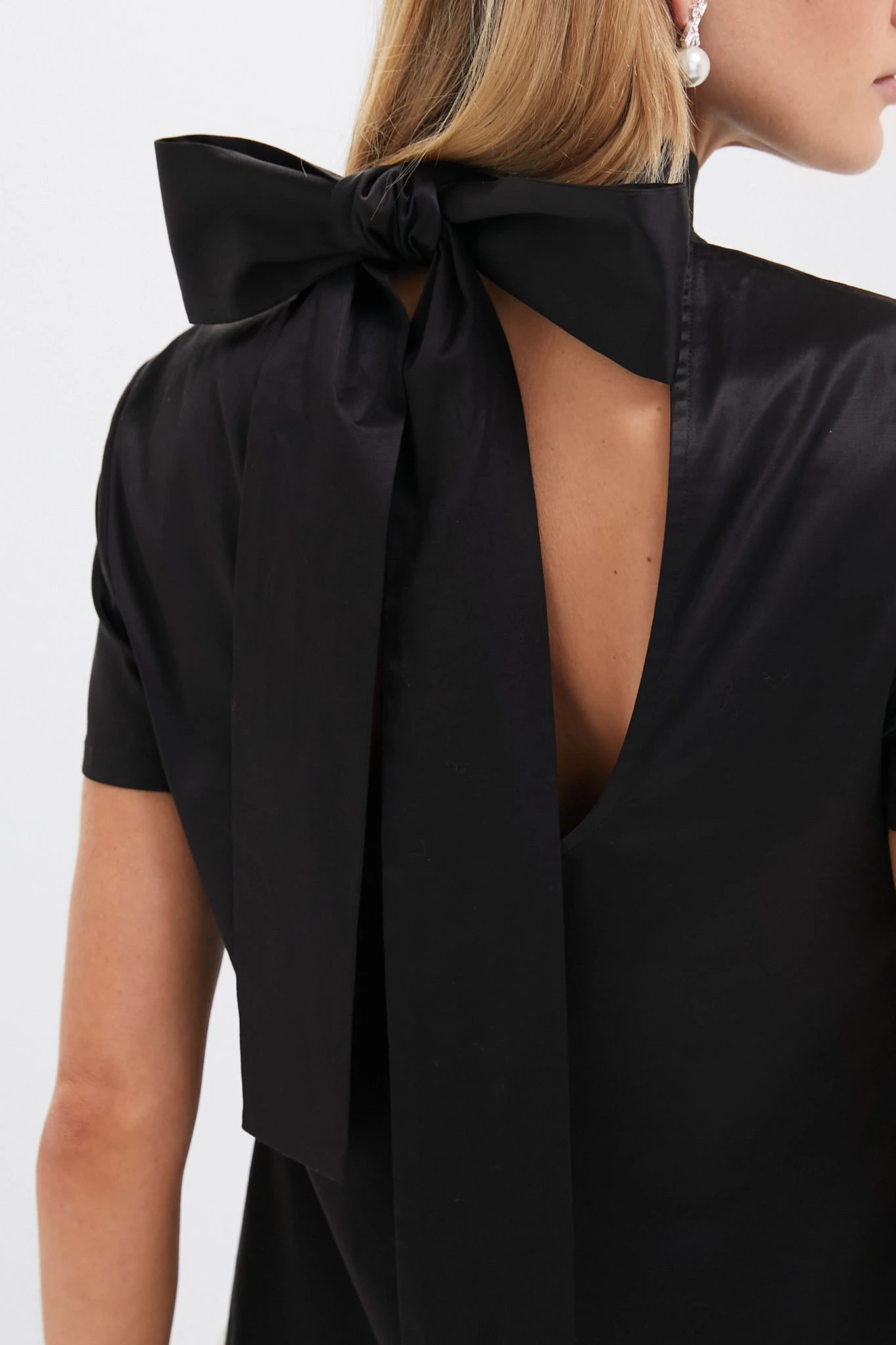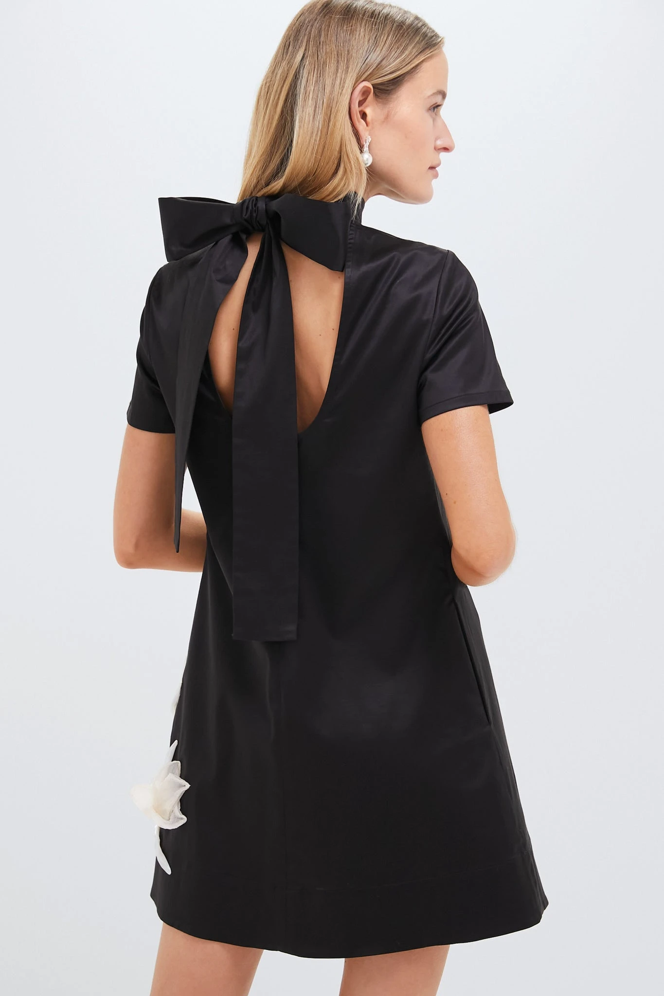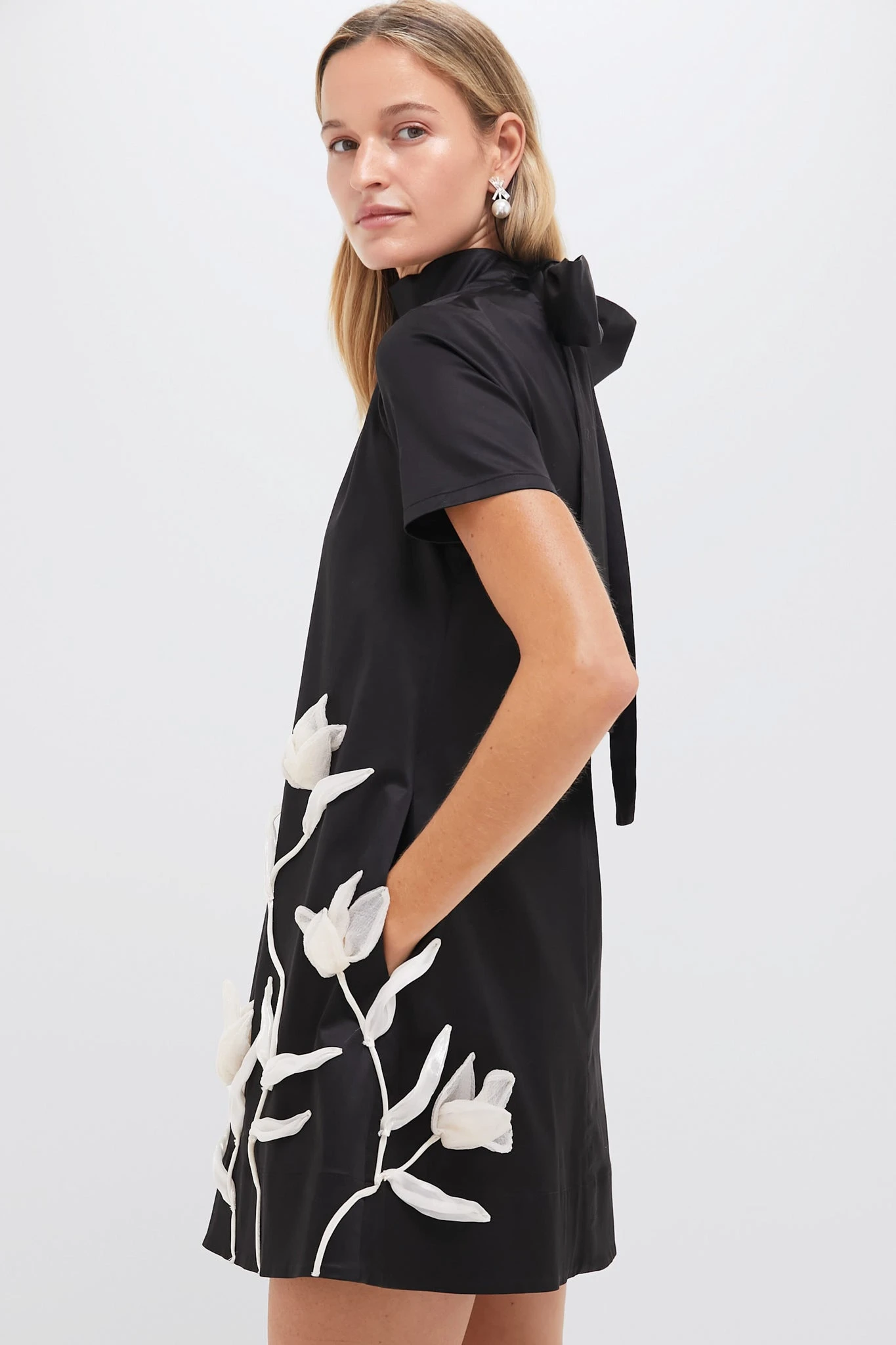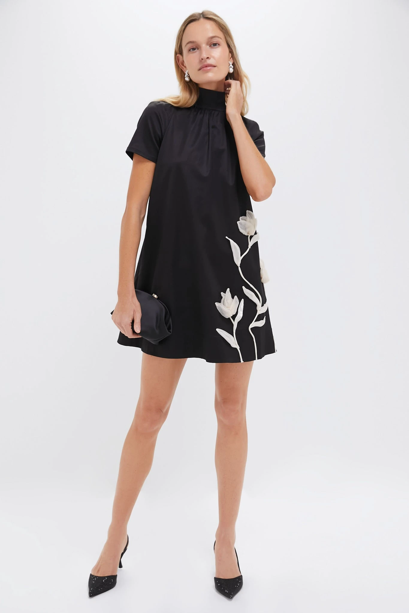 The Mini Ilana features a stunning floral applique design, a high neck, and scoop back with functional self-tie bow collar. We chose to pair this showstopping LBD with a chic earring, black clutch and heels, perfect for when you’re not sure what to wear to your next cocktail event!