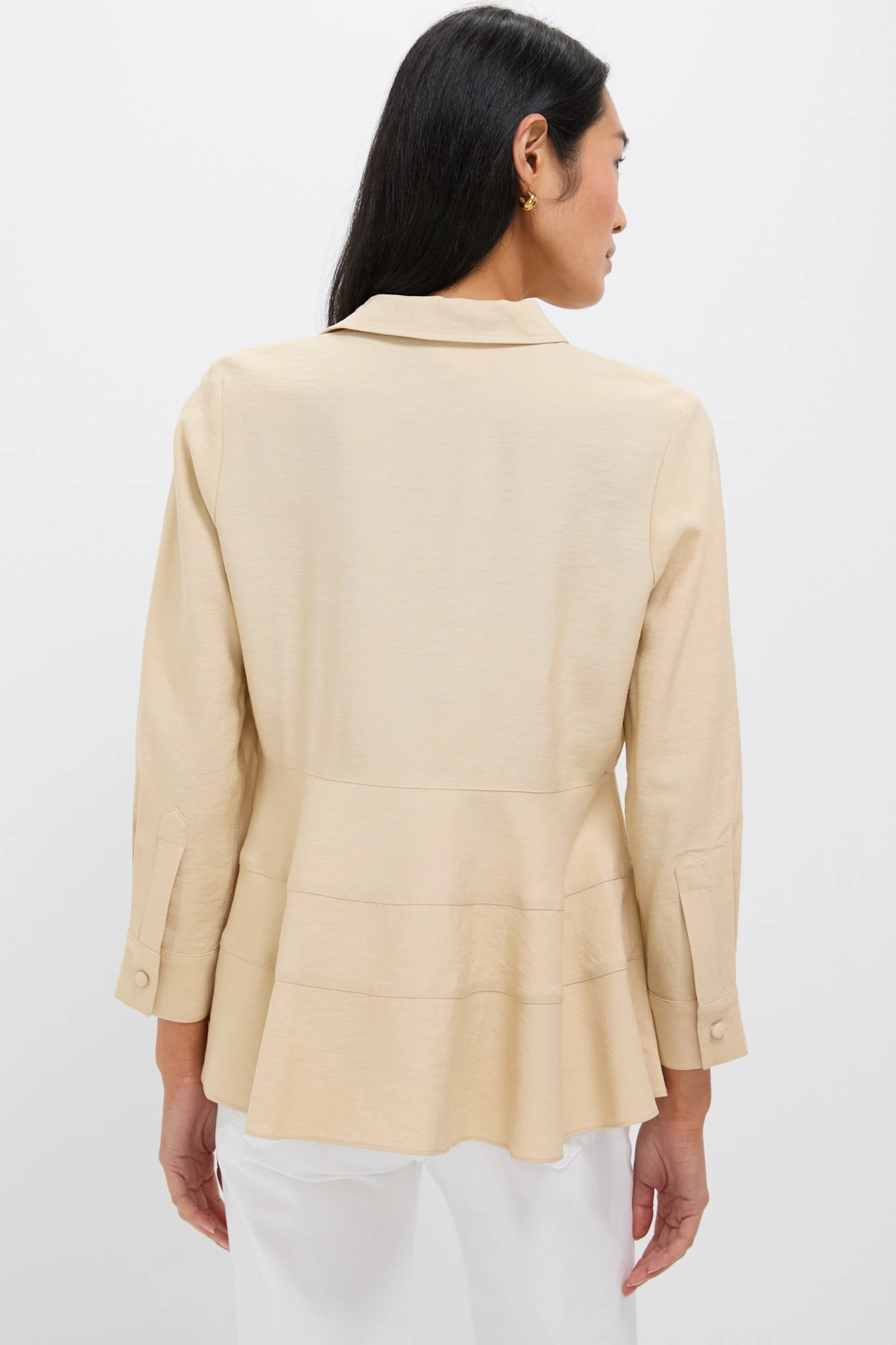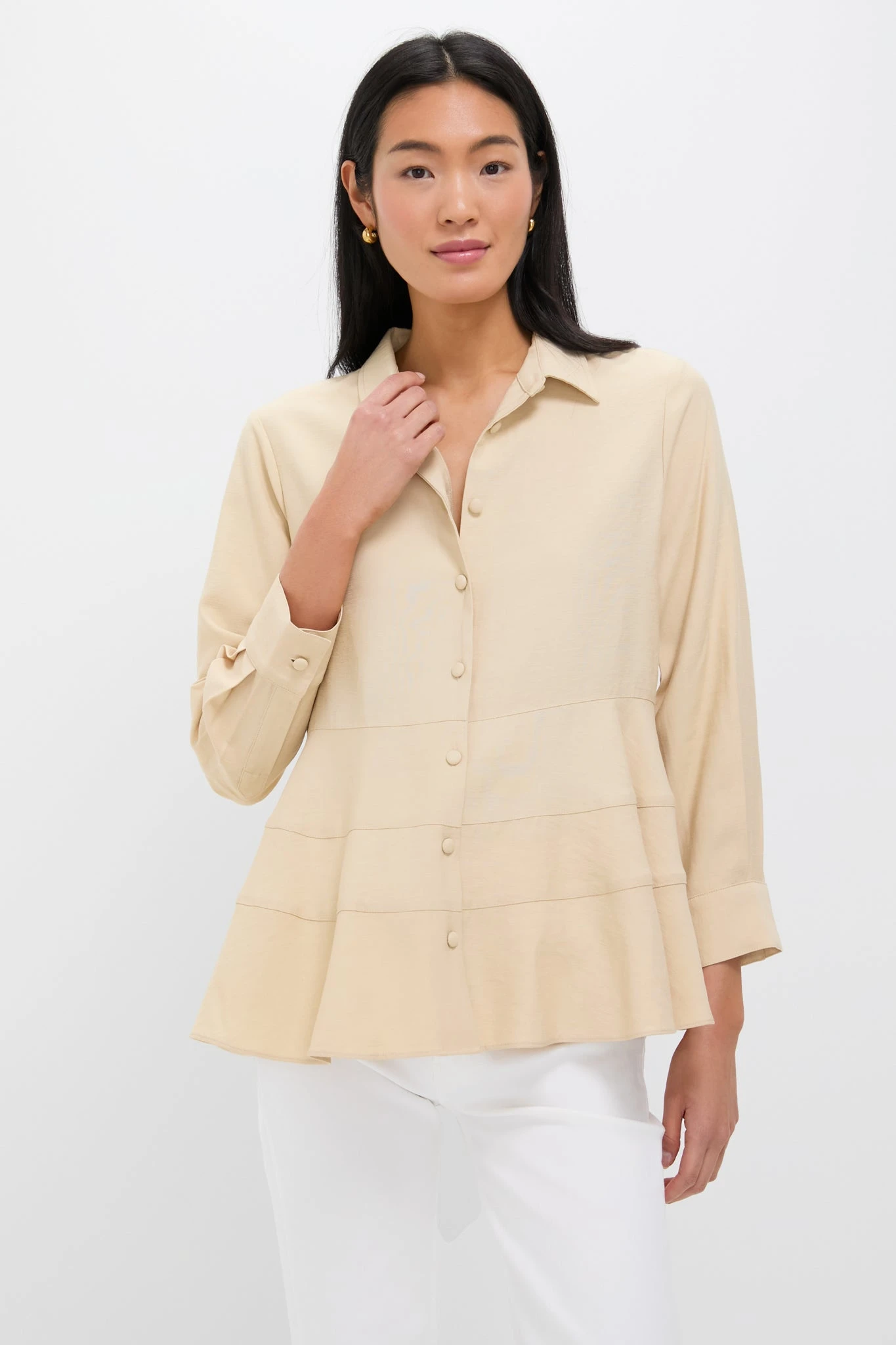 Your traditional button down with a twist, the Tan Ashlen Blouse is the easiest piece that you need to update any look. With covered buttons that add a dash of tailored class, this subtle fit-and-flare number is designed with a tiered hem that makes it stand out in an all-over creamy colorway that pairs well with everything. From denim to trousers, heels to sneakers, work to play, this year-round top does it all and will have you looking your best with just a few classic touches.