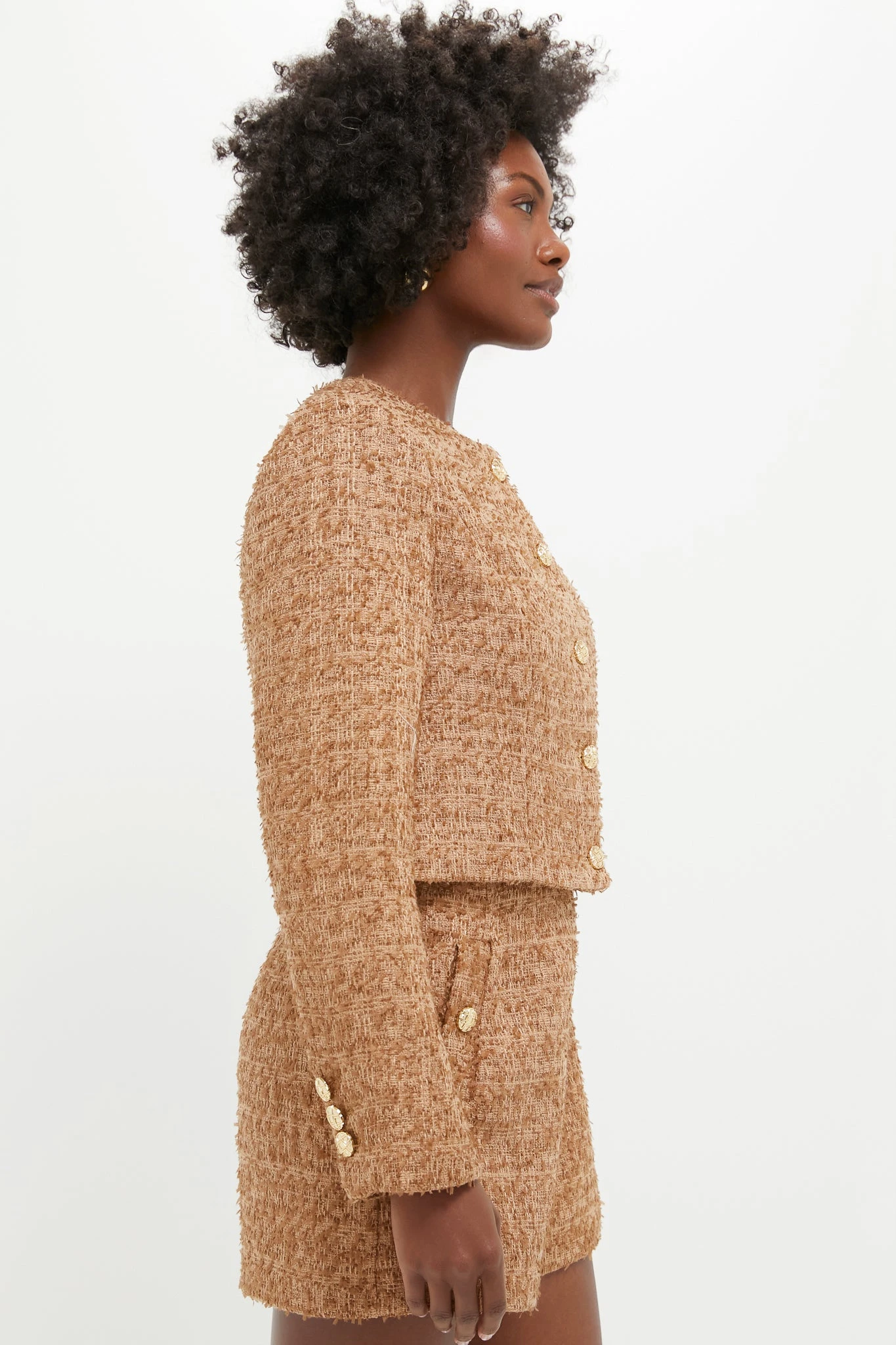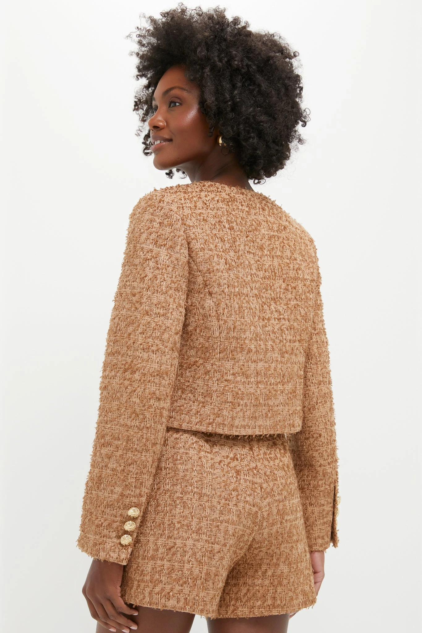 This elevated jacket is a flattering cropped style with a front button placket and boxy silhouette. Pair with the matching Tan Tweed Knox Shorts and boots or with wide leg denim and heels.