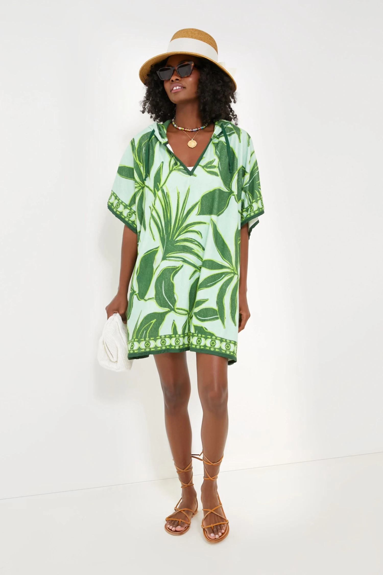 A poncho, beach towel-esque number that’s perfect for throwing on after a long day in the sun? Sign us up! The Tropical Palm Terrycloth Coverup screams unfussy dressing with it’s oversized fit, drawstring hood, and jersey interior that feels oh so soft against your skin. Whether you are headed to the snack shack or walking the boardwalk, this mini is warm weather ready!
