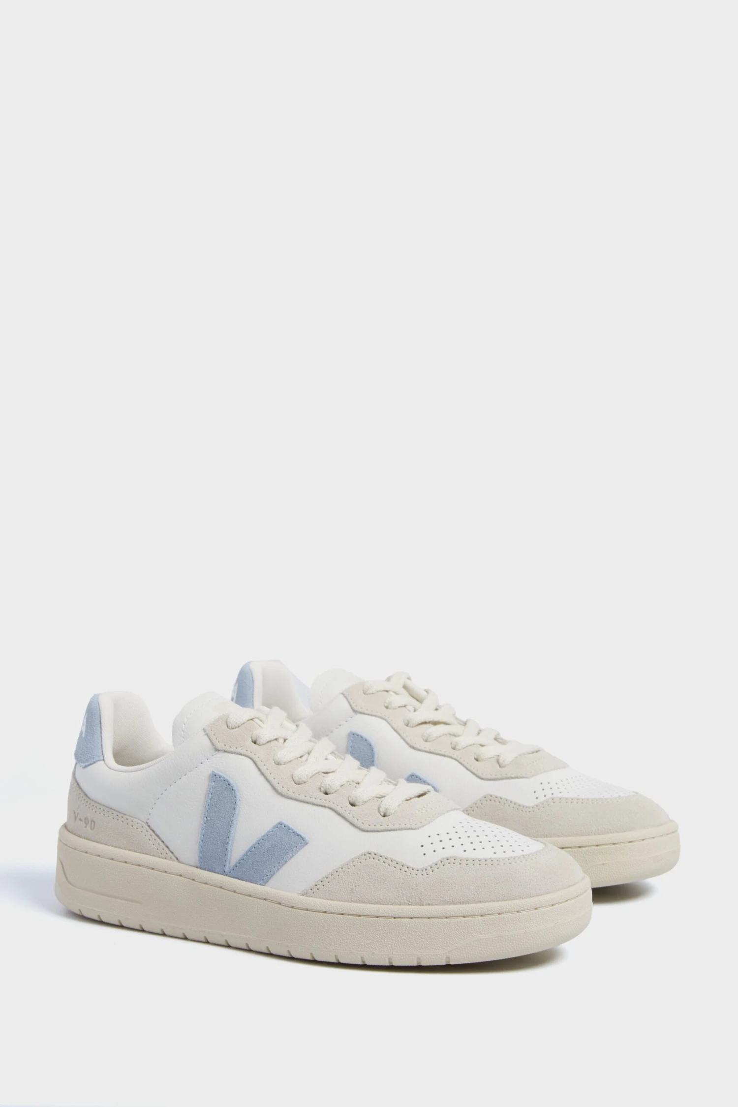 The Extra-White Steel V-90 Sneakers feature neutral colors with a pop of baby blue, making them a subtle and wearable update to the classic white sneaker. This chic pair of tonal shoes is ultra-comfortable with a padded collar and a thick flat sole, so you will reach for these to complete nearly any outfit. We love to wear them from a quick coffee run to a long day of errands, or while wandering around a new city.