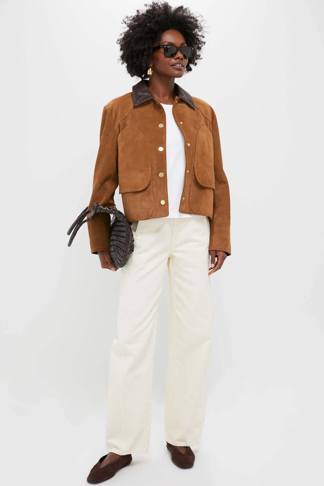 The Walters Jacket is crafted from buttery Italian suede with bold shoulder patches, oversized pockets, and a contrast leather collar that elevates the utility vibe. Its swingy, cropped silhouette layers effortlessly over tees or knits—perfect for crisp fall days or cool evenings out.