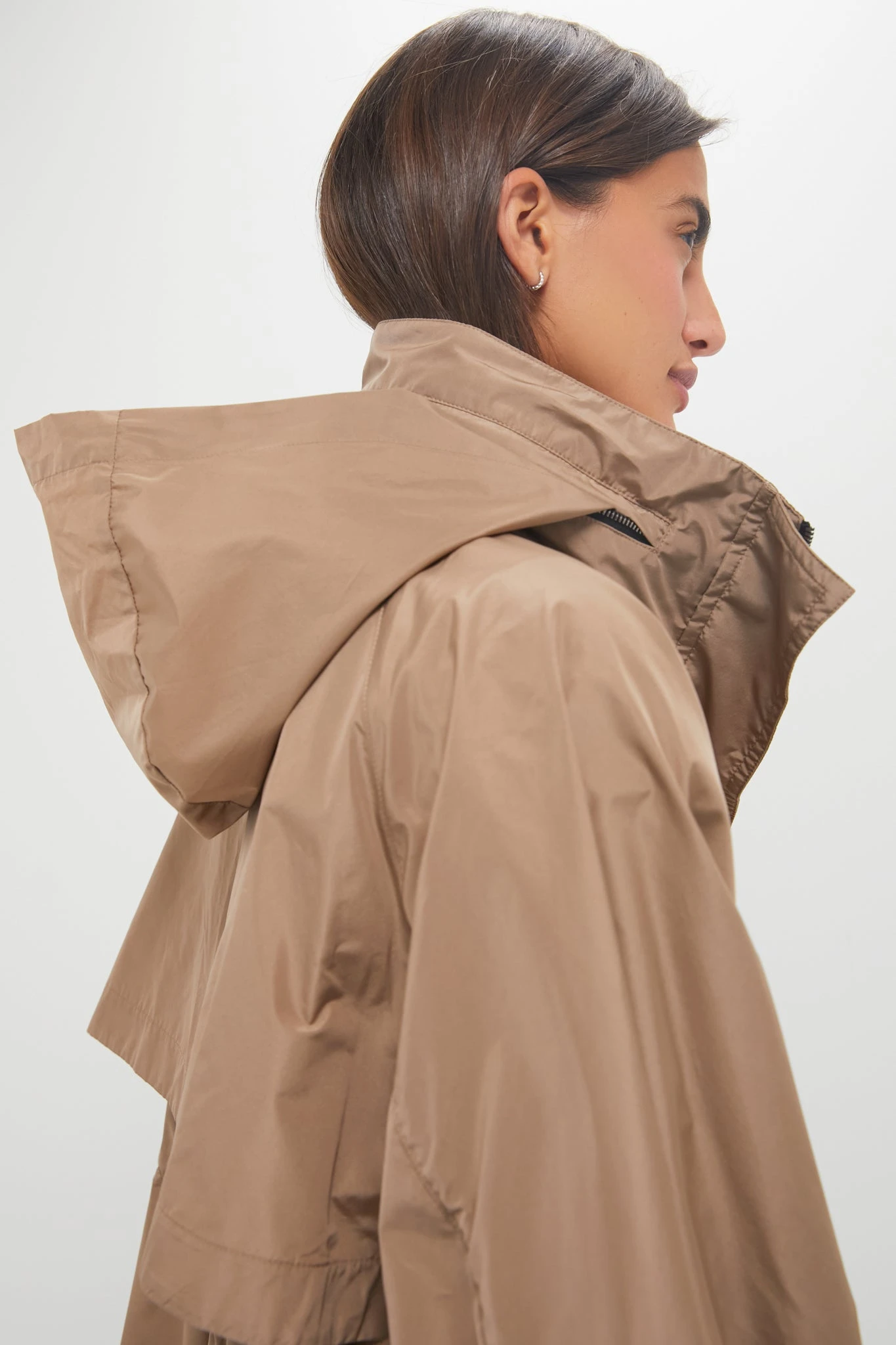- High collar with a concealed pull-out hood