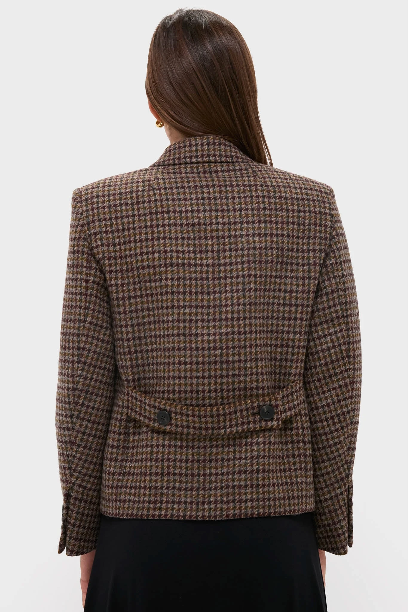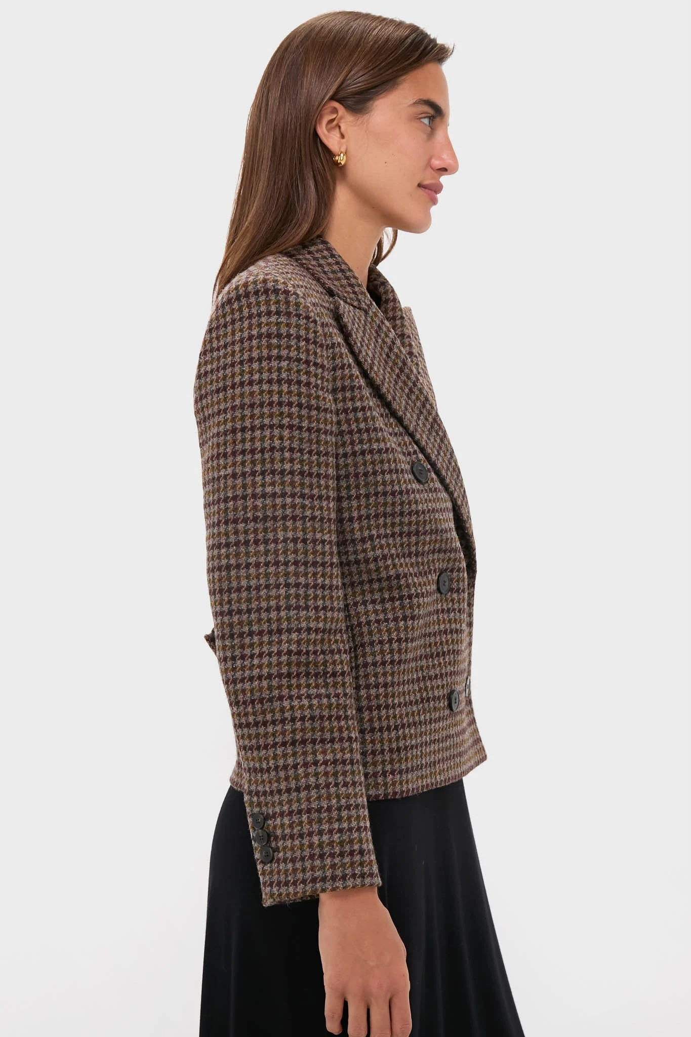 This sophisticated style is crafted from pure wool with a Shetland-effect finish for refined texture. With sharp peak lapels, a cropped double-breasted silhouette, and a buttoned back martingale, it’s a polished layer that styles effortlessly with trousers, skirts, or denim.